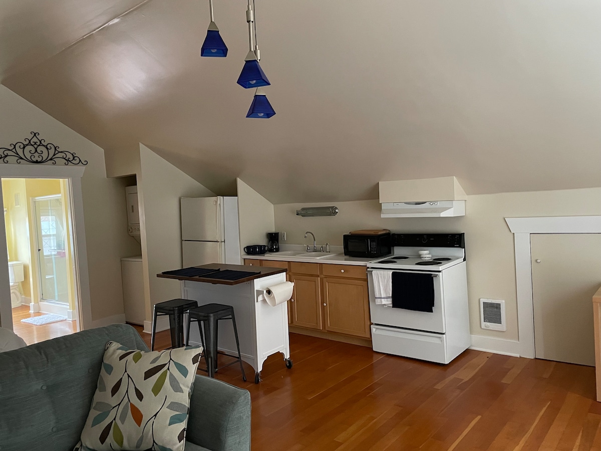 ¡Acogedor loft estudio en el centro de Puyallup! Ambiente de decoración boho urbano que te hará sentir como en casa. Baño privado completo y cocina con barra de café, freidora de aire, microondas, olla de cocina lenta y tostadora. Amplio espacio de estudio con una cómoda cama y una zona de estar separada para relajarse. ¿Vienes a la ciudad por trabajo? Plancha, tabla de planchar y secador de pelo incluidos para un viaje sin estrés. Quédate un poco o quédate un tiempo. Ten en cuenta que hay escaleras en la entrada y zonas de baja altura en todas partes, como la ducha.