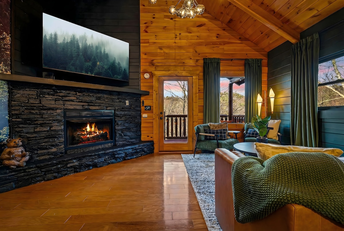 ¡Descubre por qué esta cabaña está en el Top 5% en Airbnb! ¡Hermoso, a 1 milla de Parkway y la isla! 2 espaciosas suites King Master para una noche de descanso. ¡2 baños privados completos, sofá cama, sauna, jacuzzi, sala de juegos y chimenea! MUCHAS comodidades. Te encantará este nivel abierto de 1 nivel y 3 juegos de puertas francesas al balcón privado. Relájate en el porche delantero con vistas al valle o disfruta del jacuzzi en el gran espacio del patio trasero. La sala de estar tiene techos altos y una acogedora chimenea para un retiro.