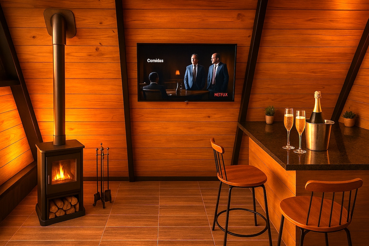 Cabaña de 72 m2 (estilo A) (privada) con 2 dormitorios, vista increíble. NO SERVIMOS DESAYUNO NO ACEPTAMOS MASCOTAS NO ACEPTAMOS AUTOS ELÉCTRICOS ✔ Chimenea ✔ Televisión inteligente de 40 pulgadas. ✔ WIFI Mesa de oficina en✔ casa ✔ Cocina ✔ Agua caliente en la cocina y el baño ✔ Cuna. ✔ Cafetera Nespresso ✔ Secador de pelo Aparato del✔ fundador ✔ Alexa ✔ Hidromasaje con cromo frente a la cabaña de vidrio Área externa: ✔ Zona gourmet con barbacoa, lavabo y mesa ✔ Incendio ✔ 1 Pergolado ✔ Estacionamiento