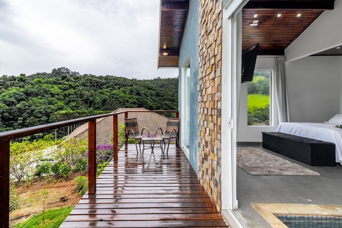El chalet Luar da Montanha trae una experiencia verdaderamente única con un toque de sofisticación. Uno de sus mayores atractivos es la vista de las montañas distantes acompañadas de una hermosa puesta de sol y junto a la selva nativa. Su espacio exterior cuenta con balcón y garaje, mientras que su área interna ofrece una cama king size, TV de 32 (Sky), un delicioso jacuzzi (doble), todo con vista panorámica al bosque y las montañas. Cuenta con una cocina completa y equipada, y una mesa de apoyo en el dormitorio y en el balcón.