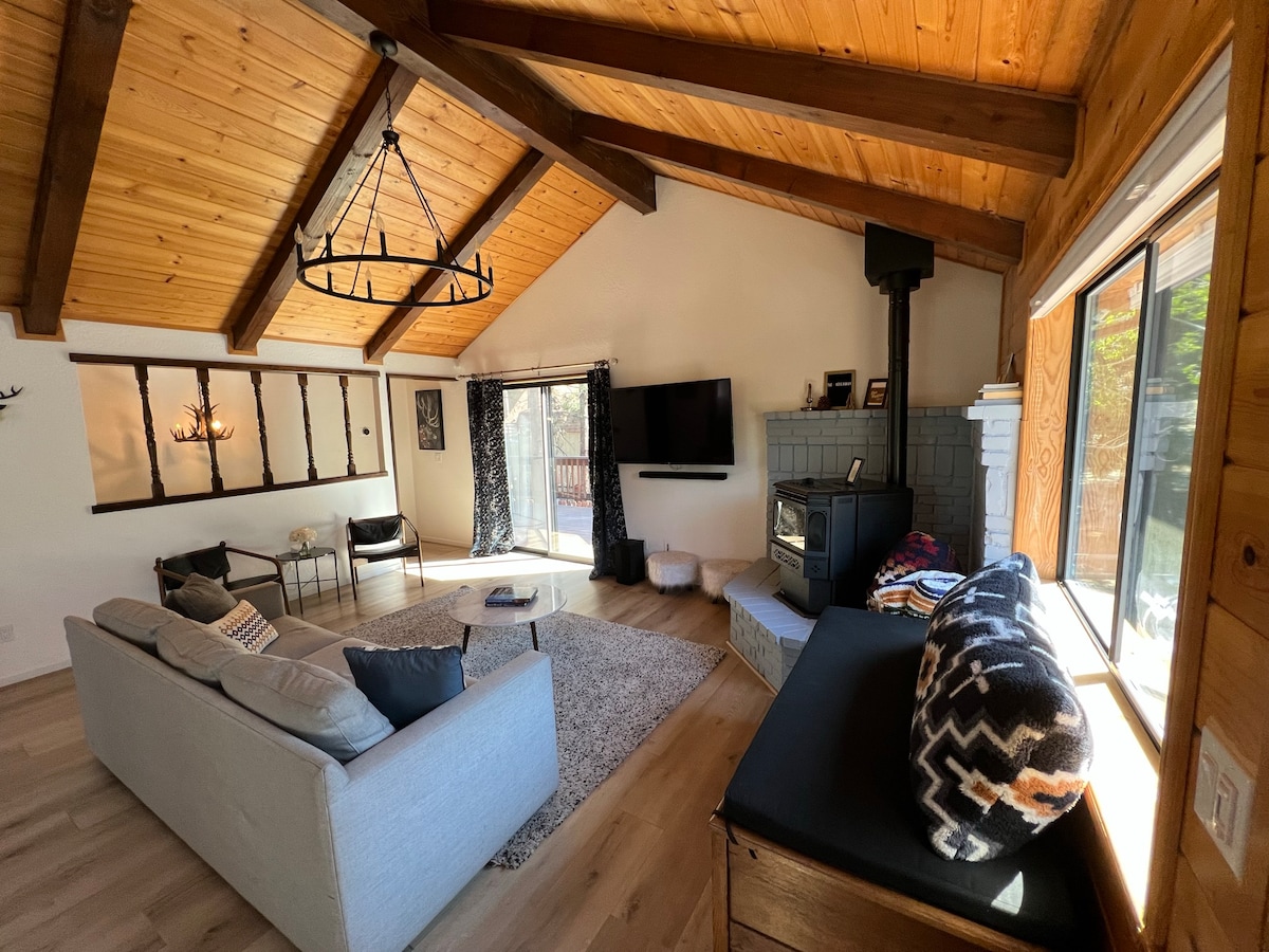 Disfruta de las montañas en una propiedad con un ambiente único. Ubicado en el borde del monte Pinos, nuestra cabaña en la copa de los árboles tiene excelentes vistas y es más privada que la mayoría de las cabañas en PMC. Está bellamente diseñado y cuenta con ventanas del piso al techo, acabados superiores, arte curado, chimenea de leña, barbacoa, cocina Viking, ropa de cama, wifi Starlink y bañera de inmersión. Es el lugar perfecto para un fin de semana de cocina, relajación y estar en la naturaleza.