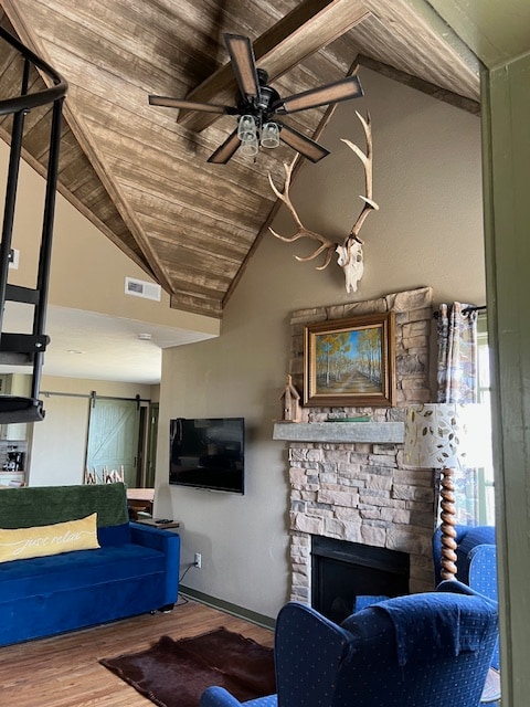 Cabaña enclavada en un pintoresco rancho, con un estanque sereno y exuberantes prados de heno. Mezcla perfecta de encanto rústico y comodidades modernas; cocina, lavadora/secadora, wifi, televisores, cama tamaño king, ducha a ras de suelo, etc. La gran terraza ofrece impresionantes vistas a la montaña y al agua tranquila. La chimenea de gas al aire libre proporciona calidez y un ambiente acogedor. Disfruta de la pesca de truchas, la observación de aves y los avistamientos de alces en el lugar. Esta ubicación ofrece una experiencia única e inmersiva en la vida rural, de camino a Jackson Hole y Yellowstone.