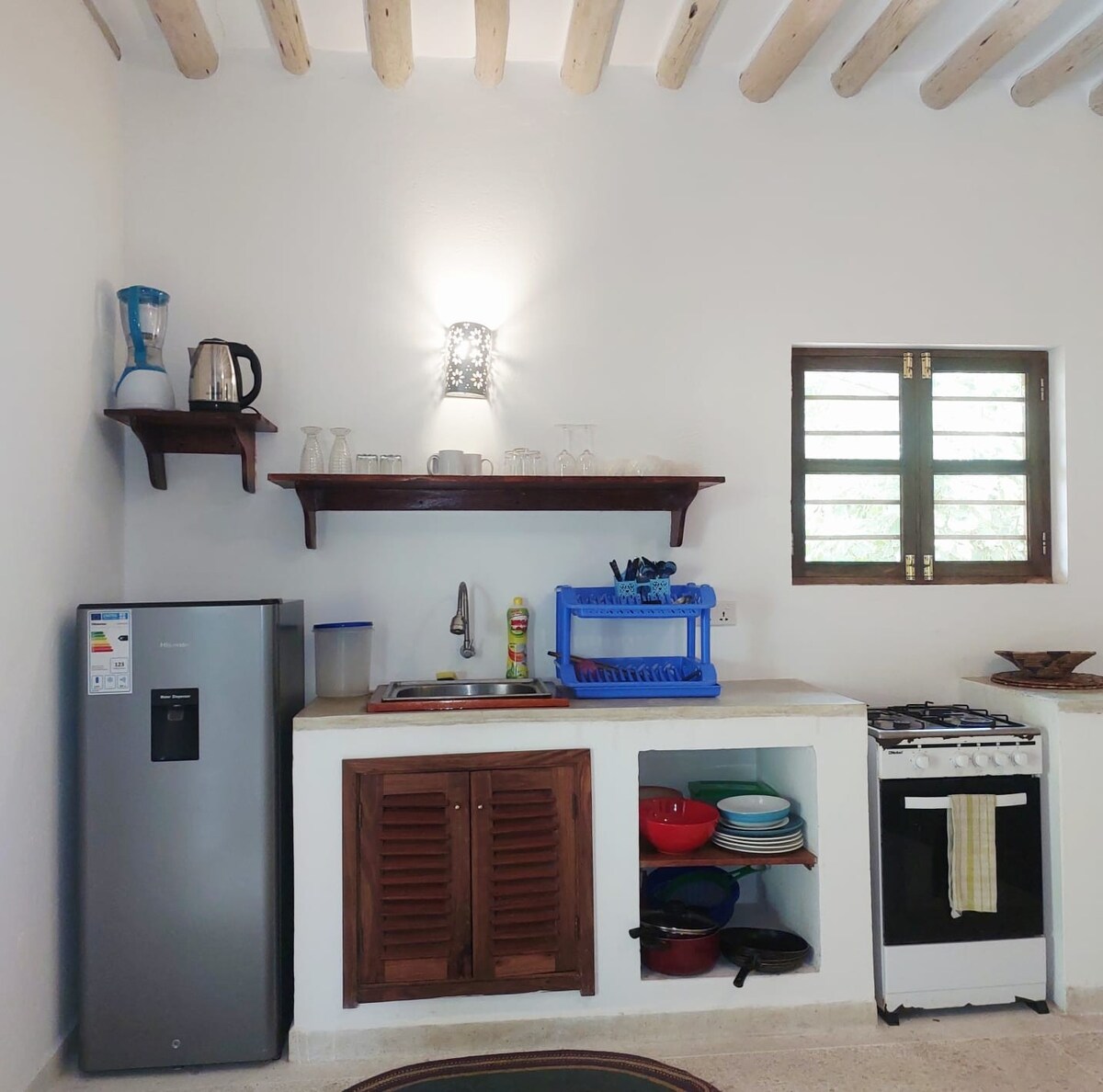 Este sencillo pero cómodo eco-bungalow se encuentra a menos de 1 minuto a pie de la famosa playa de Paje, la meca del kitesurf, los lugareños acogedores, los buenos restaurantes y la vida nocturna. Todo el alojamiento es exclusivo para ti. Consta de 1 habitación con una cama tamaño king con mosquitera y ventilador, baño privado con inodoro y ducha de estilo local (sin lavabo). Además de un patio privado con sofá y una línea de lavado. Al lado está nuestro restaurante con deliciosos platos internacionales.