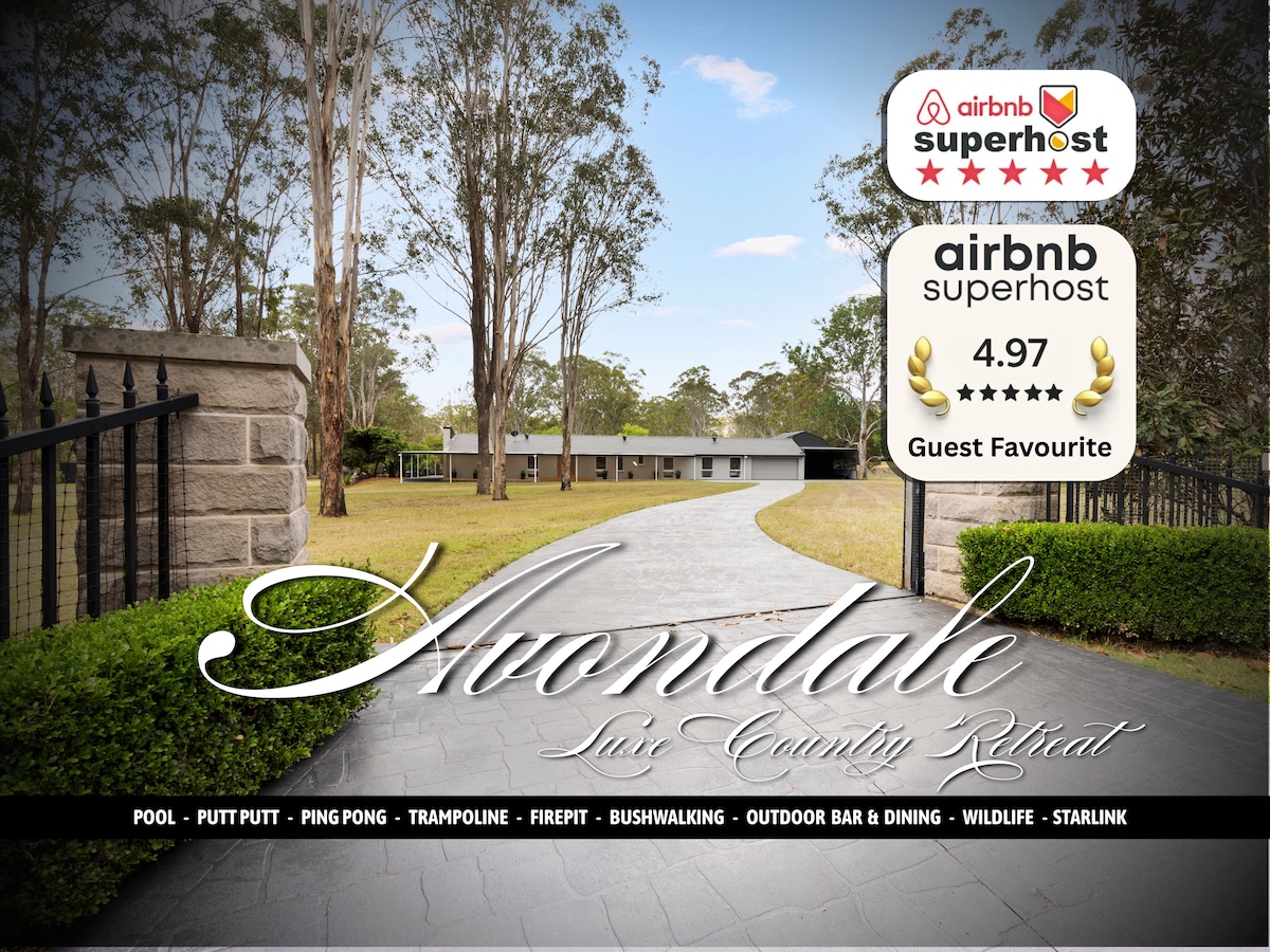Luxe Country Lodge: retiro en la selva de Sídney. «Avondale» es un lujoso albergue rural de 5 dormitorios ubicado en el borde del impresionante «bushland» australiano. A poco más de 1 hora de Sídney y a 10 minutos de Windsor, Avondale te ofrece la combinación perfecta de relajación, comodidad y actividades para jóvenes y mayores. Olvídate de vecinos ruidosos y luces de la ciudad; aquí, las estrellas cobran vida en el cielo nocturno y la vida silvestre es abundante. NOTA: Avondale no es un destino para fiestas.