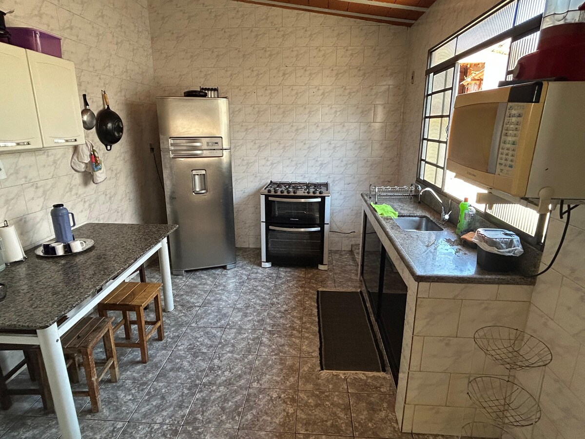 *1 habitación con cama de matrimonio box queem y humidificador. *1 suite doble con cama doble box queem y aire acondicionado. *1 habitación con 2 camas individuales y humidificador. * 2 colchones individuales para colocar en el suelo *Wi-Fi y TV por cable. Todo en porcelanato, garaje, fondos con cocina exterior y ducha. Lugar muy tranquilo, fácil acceso al Capitolio y Serra da Canastra, con tiendas de comestibles a 100 metros y un supermercado a 900 metros. Hacemos itinerarios y programaciones para excursiones