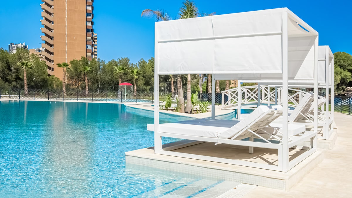 Situado en la planta 24 a tan solo unos minutos caminando de la playa. Cuenta con dos dormitorios: una habitación principal con baño en suite y vistas panorámicas al mar y otro dormitorio con vistas a la montaña. También tiene una espaciosa terraza con impresionantes vistas al mar. En la planta 26 encontrarás piscina con vistas panorámicas al mar, sauna y gimnasio. En la zona exterior, podrás disfrutar de dos piscinas, jacuzzis, pista multi deporte, parque infantil y pistas de pádel.