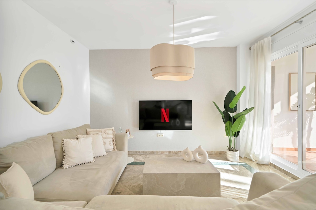 Bienvenido a este elegante y relajante apartamento con 2 dormitorios / 2 baños y una gran terraza cubierta con vistas al mar y vistas increíbles al atardecer todas las noches Los huéspedes podrán acceder a 3 piscinas con tumbonas y muchas zonas verdes. Televisión inteligente, wifi rápido, aire acondicionado frío, estacionamiento subterráneo, todo incluido. Está a 7 minutos en auto de Estepona y a 2 minutos de muchos supermercados, está cerca de Marbella, Puerto Banús, Sotogrande, Ronda y otros destinos de interés. Casa club con restaurante a solo 5 minutos a pie.