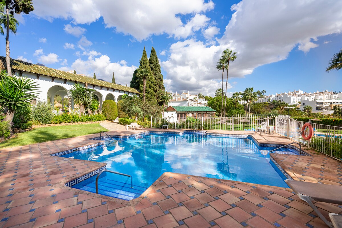 Uniquely located apartment at 3m walking from beaches, Puente Romano hotel and restaurants. It has 2 bedrooms and 2 bathrooms, with a spacious kitchen and living. In total the size is 90m2. The sunny terrace (West) is 30m2 and a great place for dining and chilling moments. All baby equipment is there. You can park your car in front of the door, behind the Fase II gate, or in the garage. The garden has 2 pools with sun beds to use. A lovely place with everything you need, for a perfect holiday!