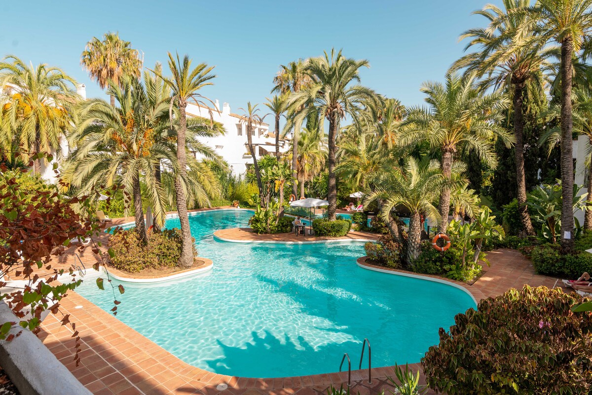 Recently back on Airbnb. Luxuriously furnished apartment located in Puente Romano phase 2 and fully equipped. The apartment is located on the Golden Mile next to the 5 star Nobu hotel. The beach with fun - and sports activities is nearby. Overlooking beautiful communal gardens and swimming pools. Lots of nice trendy restaurants/bars. Car is not necessary. The fashionable Puerto Banus and Marbella old town can be reached on foot (35 minutes) or by bus/taxi (in front of the door).