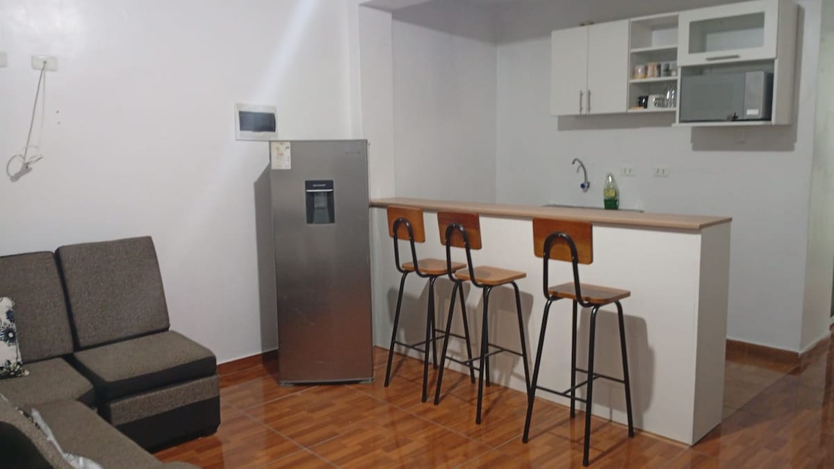 🌺Hermoso departamento🍃🌺 diseñado para compartir una bonita estadía (para una pareja, persona sola o 3 amig@s) ubicada en el tercer piso de una casa.Tiene una amplia sala-comedor, equipada para que puedas preparar tus mejores platillos🍝🍹🥂, un balcón para contemplar hermosos atardeceres mientras te meces sobre una cálida silla colgante, que recuerde tu niñ@ interior🍃, espacio home office, un dormitorio y sofácama 💖 Estamos a 5 minutos del centro de Huacho y Centro Comercial Plaza del Sol.