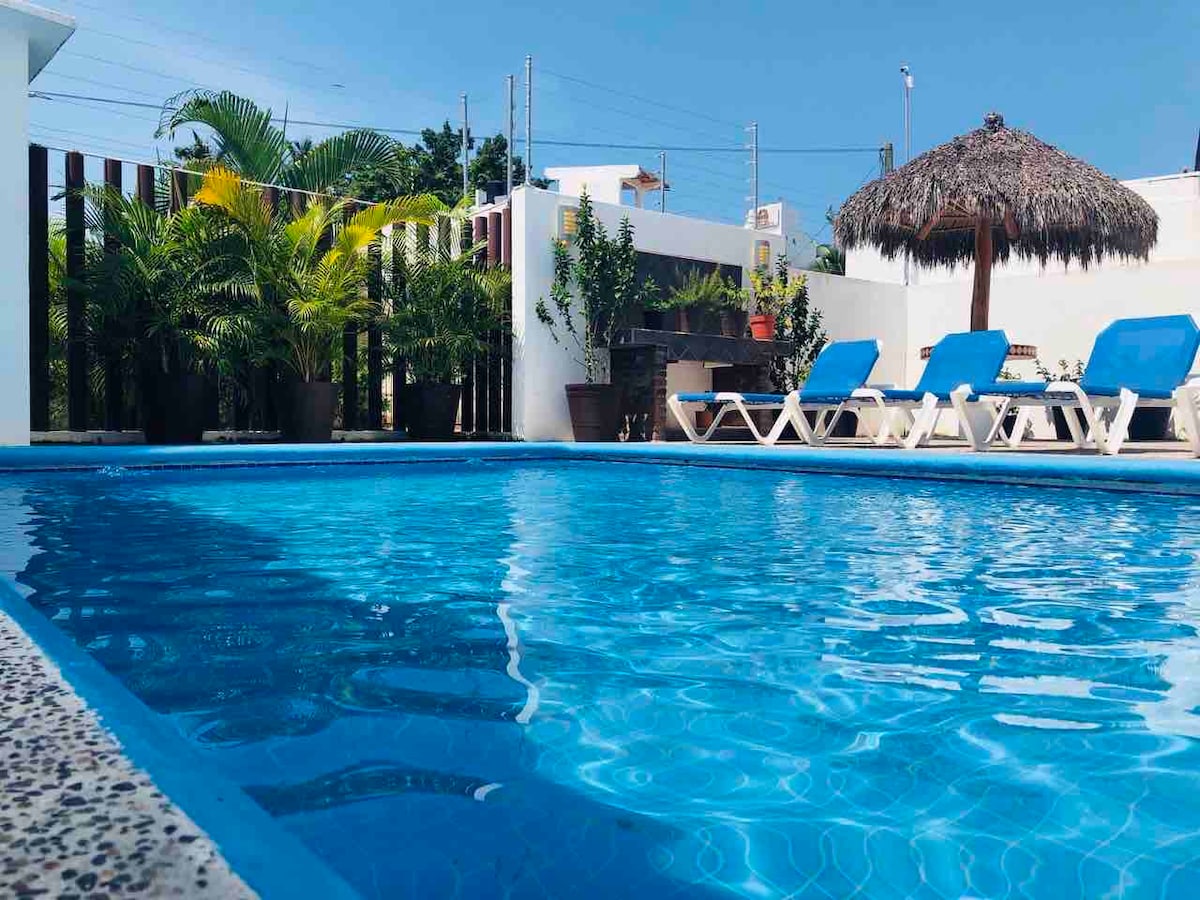 Si te gusta la naturaleza, Casa Miraflores es el lugar adecuado para ti. La casa se encuentra a 5 minutos de la ciudad en una zona tranquila. Encontrarás colibríes, chachalacas y muchas mariposas preciosas. Disfruta del concepto abierto y del salón al aire libre con piscina. Desayuna en la terraza antes de ir a la playa. La casa tiene una cama tamaño king con mosquitera en el primer dormitorio y una cama tamaño queen con mosquitera en el loft debajo de la palapa. Baño con ducha a ras del suelo.