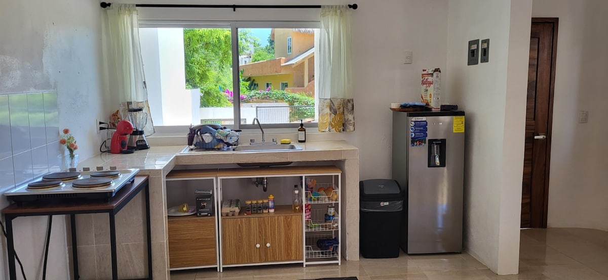 Estudio privado rodeado de naturaleza donde disfrutaras de tranquilas y estrelladas noches. La habitación es completamente Independiente, agua caliente, cama Queen size Cuenta con cafetera, frigobar, licuadora, parrilla y los utensilios necesarios para poder tomar un desayuno o cena sencillos. Tambien cuenta con area especial afuera donde podras lavar trastes y poner a secar las toallas Es de muy facil acceso a trasporte publico y a nos encontramos a10 minutos del centro de Puerto Escondido