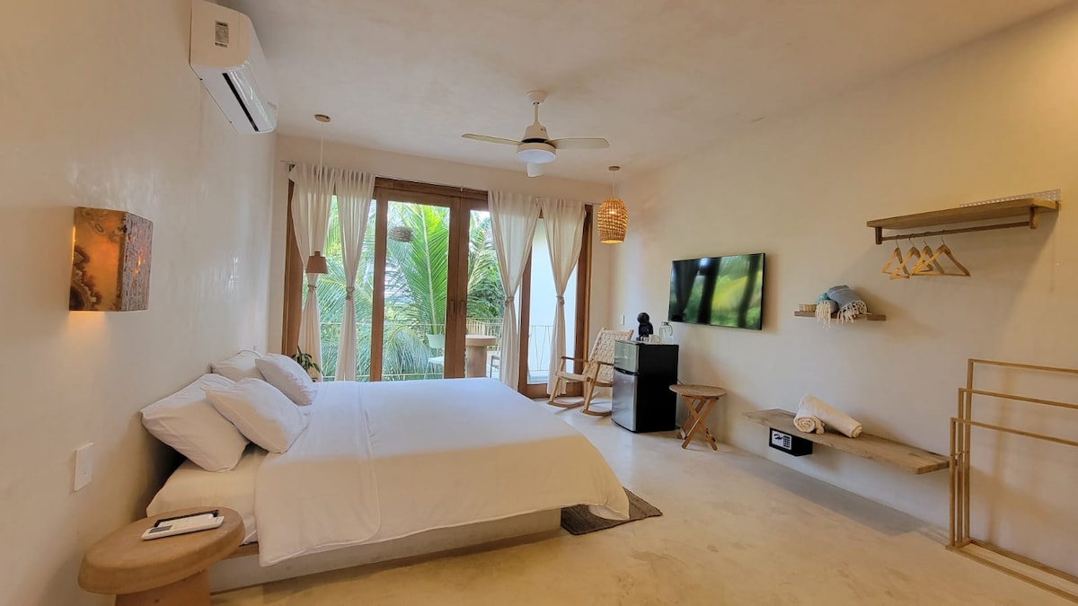 Disfruta de una habitación que te ofrece comodidades como aire acondicionado, agua caliente, una pequeña cocineta para preparar platillos a tu gusto o solo tenerla para preparar las botanas entre descanso y descanso mientras disfrutas en la terraza frente al mar.