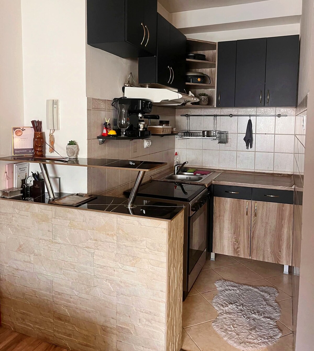 Udoban i potpuno opremljen stan u centru Podgorice – idealan za opuštanje i rad! Retro-industrijski dizajn kuhinje, udoban dnevni boravak, balkon s pogledom na zelenilo i besplatan parking.