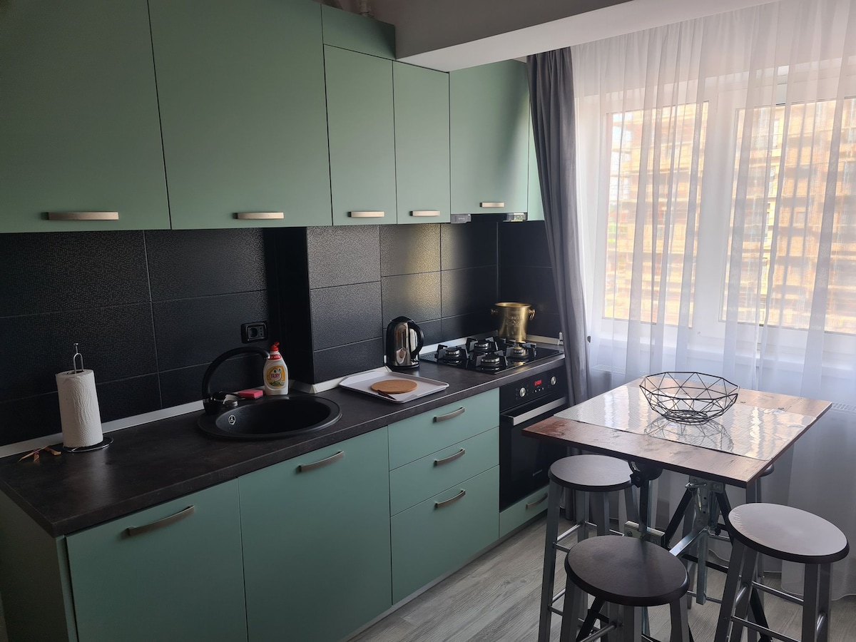 Estudio moderno, ubicado en un edificio nuevo (2023) en la zona central y tranquila de la ciudad, con una zona verde alrededor y una gran vista. Servicios: wifi, cocina totalmente equipada, cafetera nespresso, aire acondicionado, televisión inteligente. Servicios prémium: estacionamiento privado y bañera de hidromasaje para 2 personas.