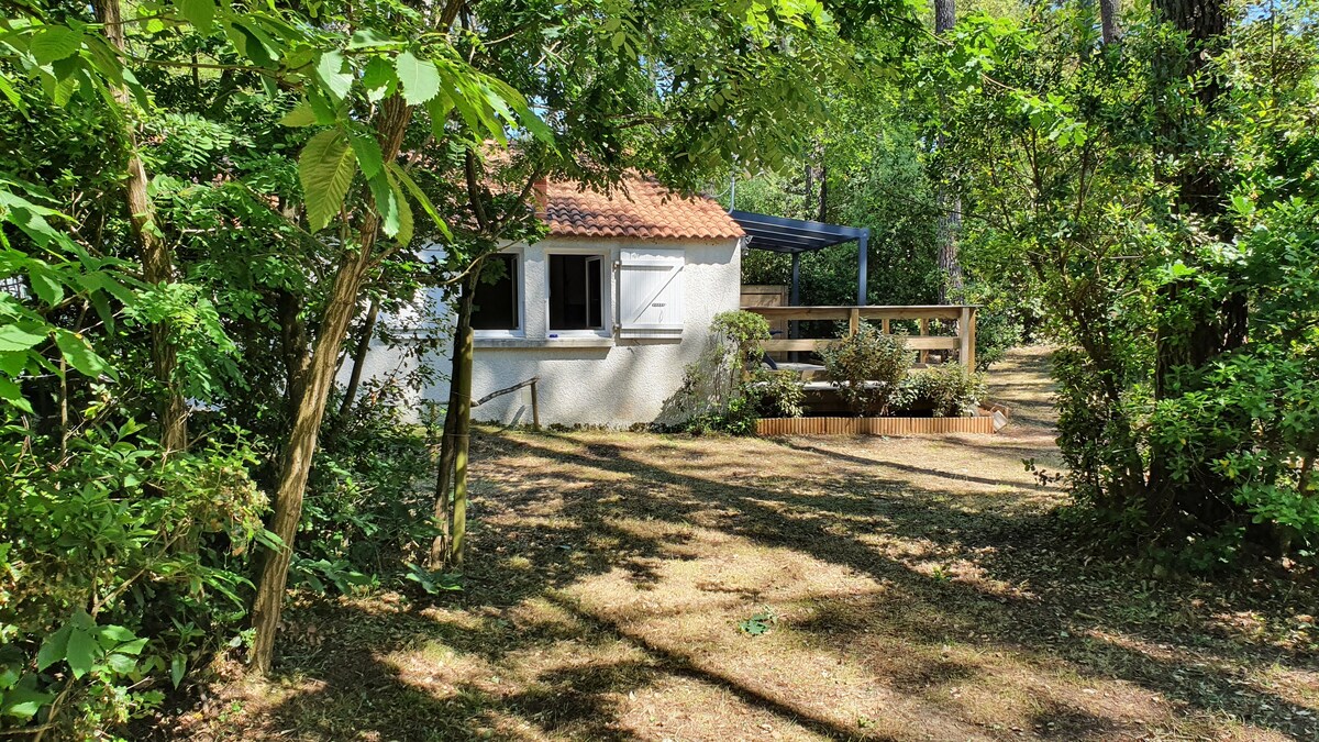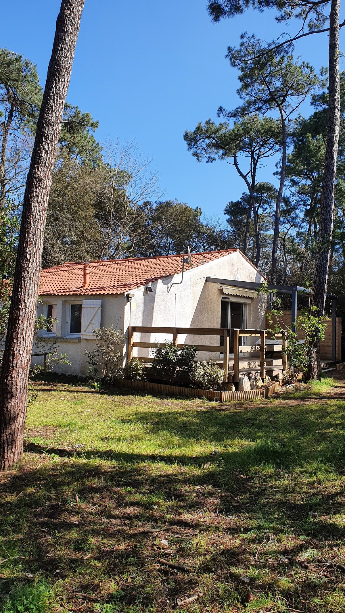 casa de pie agradablemente amueblada, situada en una gran parcela de pino marítimo,robles y castaños a dos pasos del océano, los carriles bici de Vendée(1200 klm dedicado a los ciclistas)le llevarán al pueblo de jardin en el mar y sus comercios ,su puerto deportivo y sus restaurantes, así como a otros destinos (las arenas de Olonne,la rebanada en el mar ,las marismas del pago,los grandes paseos a pie por el bosque, ) la tranquilidad , el descanso y la relajación están asegurados