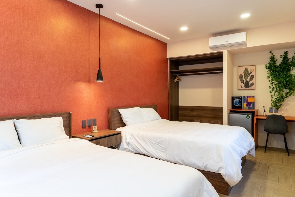 "Una acogedora habitación en terraza con el carácter audaz de Clemente Orozco." Casa Carmelia celebra el arte que dio forma a México. "José" (#06) es ideal para dos huéspedes de corta estancia. Baño privado. A solo pasos del bullicio de La Condesa, rodeada de restaurantes, panaderías, boutiques, bares y parques, los huéspedes disfrutan de espacios compartidos, como cocinas equipadas, comedor y una terraza en la azotea. Sumérgete en la vibrante energía de La Condesa. Construcción aledaña 🚧🎧
