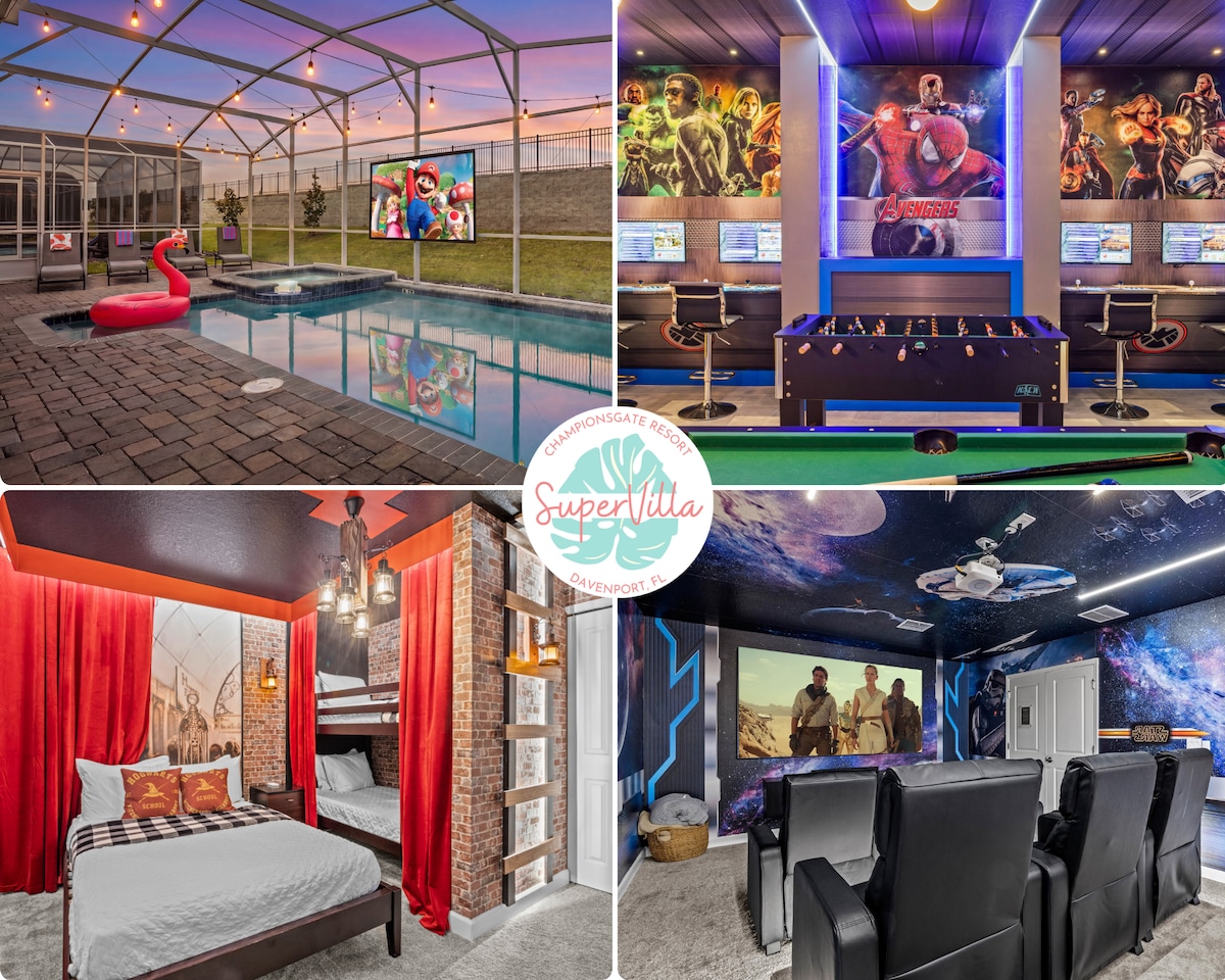 El equilibrio perfecto entre DISEÑO CON ESTILO, CONFORT DE LUJO y ENTRETENIMIENTO SIN FIN, bellamente situado con impresionantes vistas en el extenso Reunion Resort de 3,5 millas cuadradas. Tendrás tu propia piscina privada, spa con cascada, sala de juegos y cine de STAR WARS con pinball, juegos de arcade clásicos y karaoke, sala de niños de MARVEL con tobogán de tubo y literas dobles, la última Xbox Series S, una amplia terraza de piscina de 2000 pies cuadrados, chimenea e incluso un armario de HARRY POTTER escondido debajo de las escaleras, a pocos minutos de Disney.