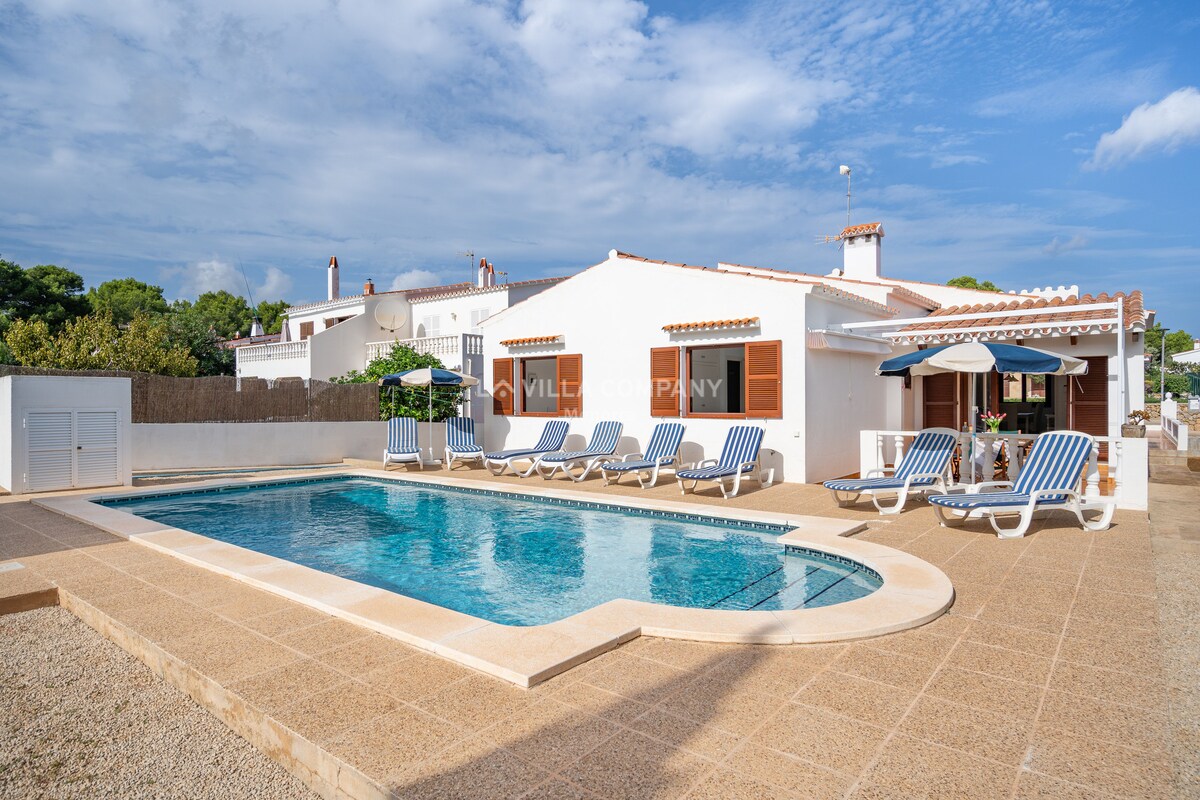 Moderna villa con piscina situada en Macaret, una de las zonas con más encanto paisajístico de Menorca, un lugar inigualable que invita a la desconección total. Es una urbanización muy autentica y nada turística: la villa al estar situada al final de la urbanización, apenas tiene vecinos. Tranquilidad está garantizada. La villa disfruta de inigualables vistas; desde las terrazas se puede apreciar maravillosas puestas del sol. Delante de la casa, a través de las rocas se puede acceder al mar.