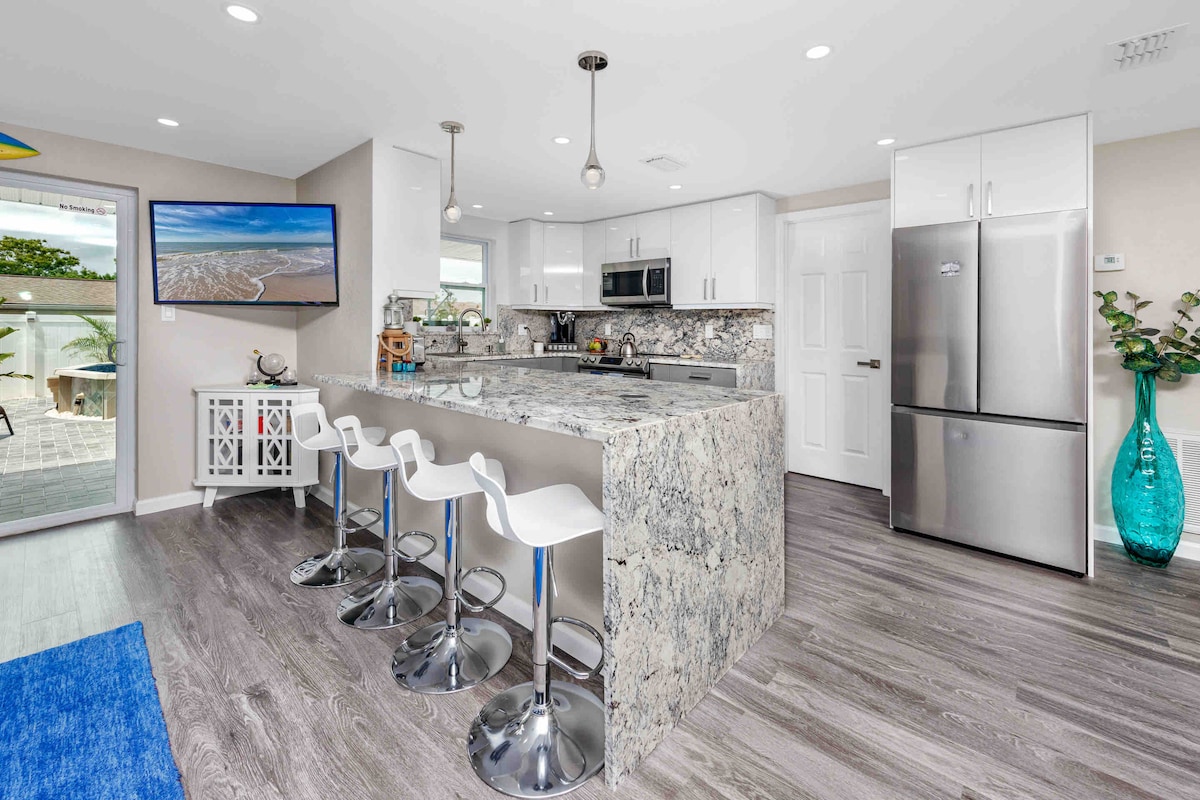 🌴 Escápate a tu propio y acogedor pedazo de paraíso, a solo una cuadra de las tiendas, cafés y Sims Park del centro histórico de New Port Richey, y a solo minutos de Green Key Beach. El refugio recién renovado de 1 dormitorio cuenta con muebles totalmente nuevos, una cocina moderna totalmente equipada, un televisor en el dormitorio para noches relajantes y un diseño luminoso con un paso afuera a una tranquila zona ajardinada. Ya sea que estés aquí para una escapada romántica, trabajo remoto o aventuras en la costa del Golfo, esta casa lo tiene todo.