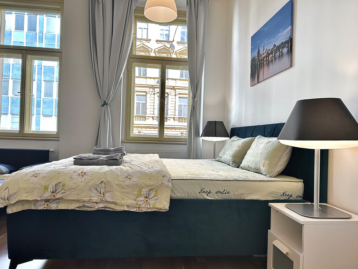 Bienvenido al apartamento President en el corazón de Praga Este elegante departamento de un dormitorio es ideal para parejas que buscan una estancia elegante en una ubicación céntrica privilegiada cerca de los principales restaurantes y transporte público. El dormitorio cuenta con una bañera independiente romántica. El departamento también ofrece un baño separado con una ducha a ras de suelo, una sala de estar, una cocina totalmente equipada y un espacio de trabajo. Las ventanas dan a la calle. El departamento está en el segundo piso. No hay ascensor.
