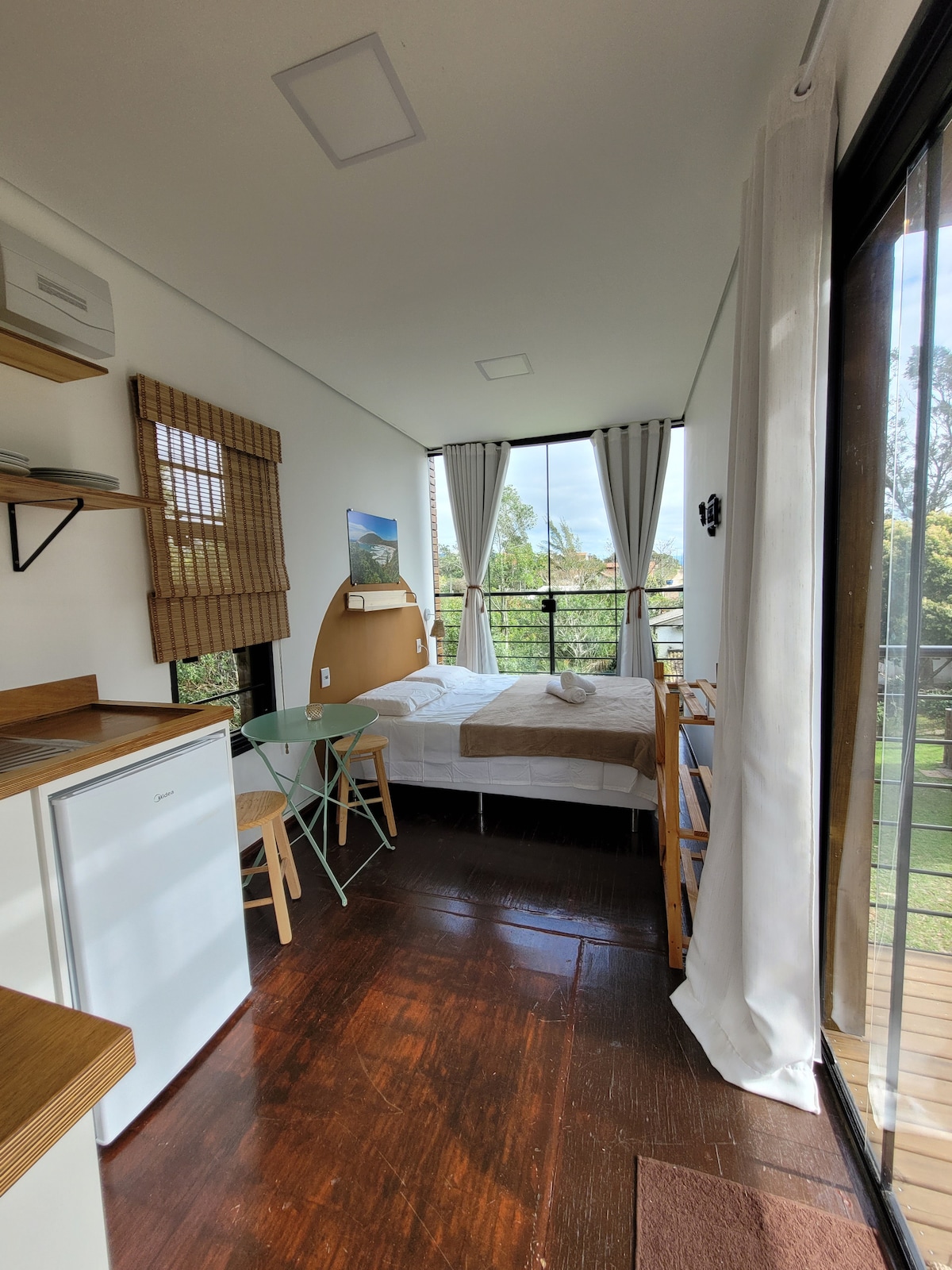Com acesso exclusivo ao telhado, o destaque é a vista da lagoa. O banheiro integrado ao quarto oferece uma vista incrível. A cozinha é bem equipada com forno elétrico, fogão de 5 bocas, geladeira com freezer e utensílios. O espaço de estar, inclui um sofá, mesa de centro e uma mesa para refeições. Um quadro de Buda sobre a lareira cria uma atmosfera serena. A qualidade das roupas de cama e banho supera expectativas. A água das torneiras é própria para beber, aquecida por energia solar.