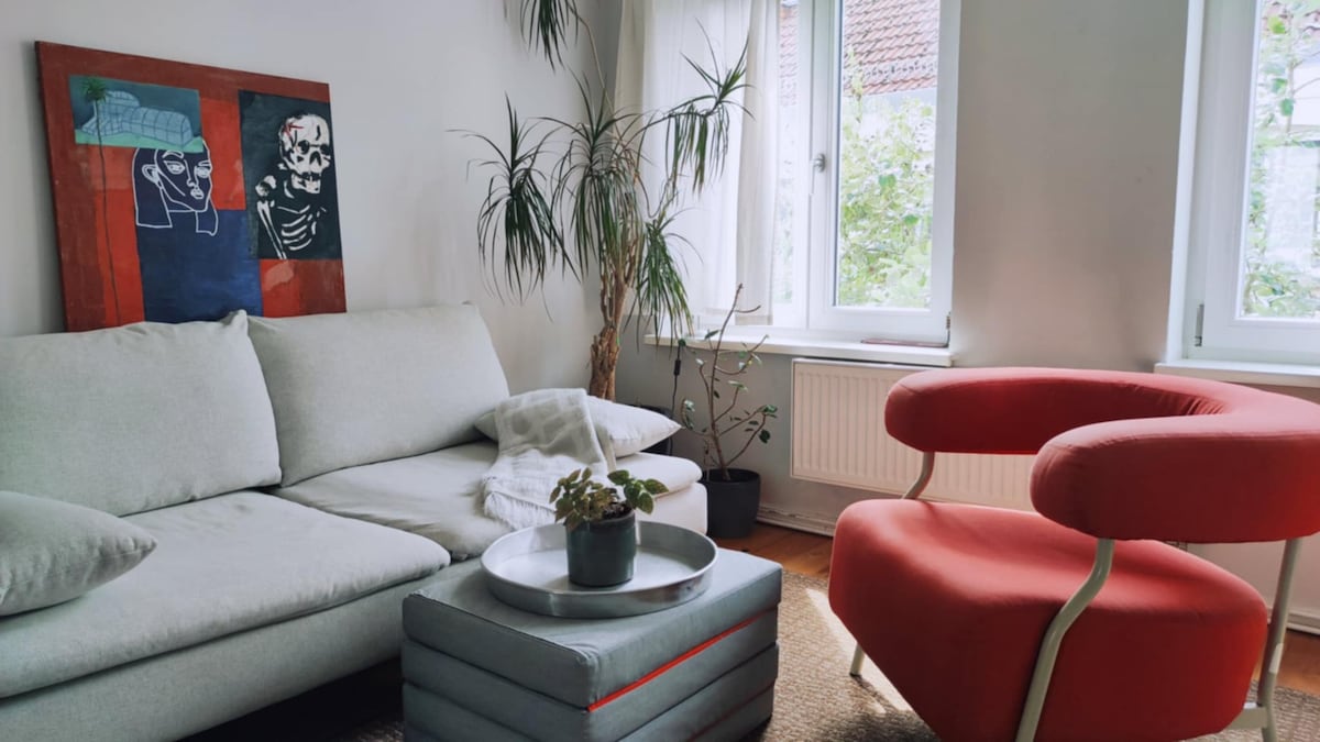 Experimenta un estilo incomparable en 90 metros cuadrados en la suite Mokka Neumünster, a pocos minutos del centro outlet de diseño, la estación de tren y el Holstenhallen. Dos dormitorios con camas de somier garantizan noches relajantes, el baño con ducha emana encanto moderno con acentos negros. Una cocina totalmente equipada y un televisor inteligente garantizan una estancia cómoda. Estacionamiento privado disponible. Ubicación (en minutos) Designer Outlet Center: 5 Estación de tren: 3 Holstenhallen: 7 Hamburgo y Kiel: 35