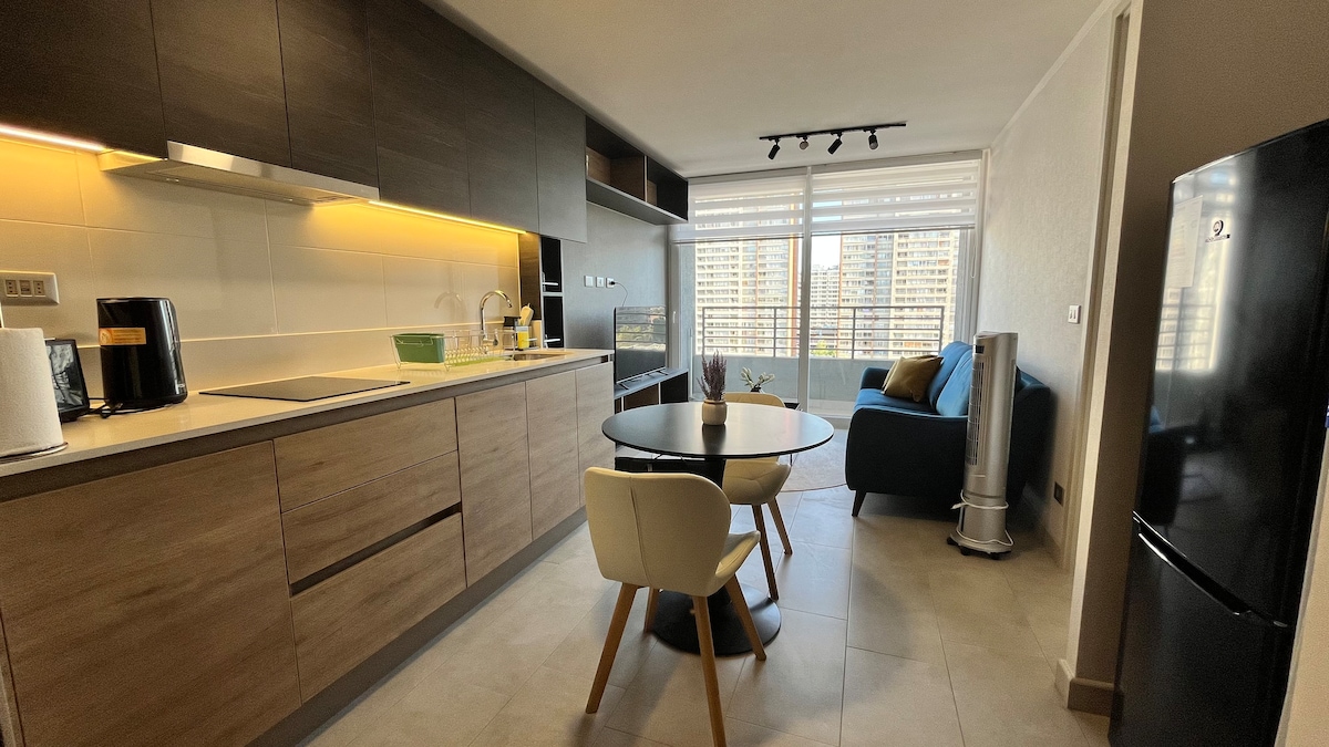 Luminoso, amplio y moderno . Ubicado en zona estratégica de Santiago de Chile, Providencia, una de las comunas con mejor calidad de vida. Polo de actividad comercial, con muchos atractivos históricos y patrimoniales. Excelente conexión de Transporte. A 3 cuadras del Mall Costanera Center y de la calle El Bosque, lugar de restaurantes, cafés y librerías. Design minimalista, cama King Size, Smart TV , Horno Microonda , Encimera y Horno Electrico, Aire Acondicionado Frio/Calor, amplio Sofa.