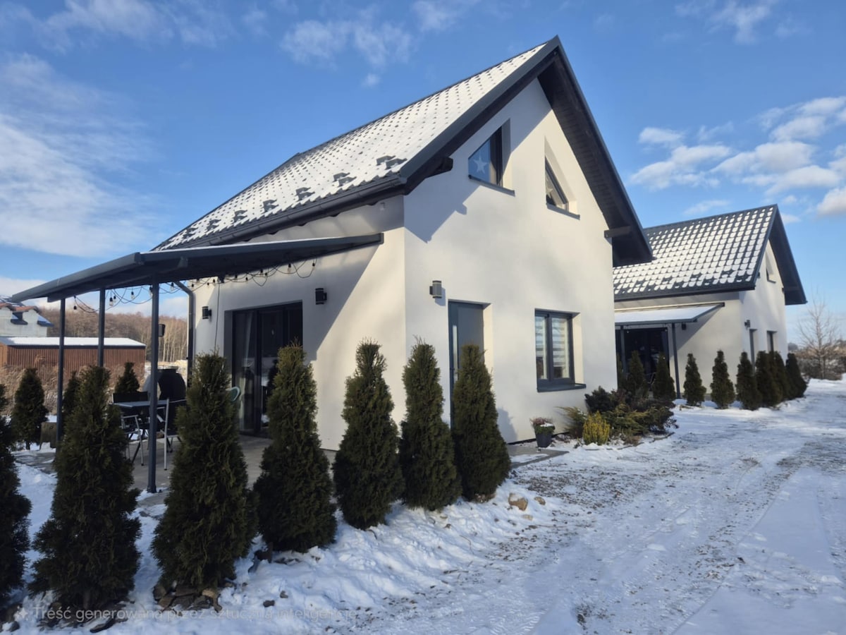 Apartamento cómodamente equipado (75 m2 ) con vistas al bosque, situado en un rincón tranquilo de Moszna, a pocos minutos del castillo, famoso por su arquitectura. Servicios ricos, 2 dormitorios, patio propio, chimenea y bañera de hidromasaje bajo las estrellas. Suelo climatizado en todas partes, un cómodo baño con una ducha abierta y una ducha de efecto lluvia, agrego un toque de relajación. La cocina y la sala de estar se conectan con una terraza con vistas al bosque y un jardín muy grande. ¡No dudes en reservar! (P.D. Wir sprechen auch Deutsch!)