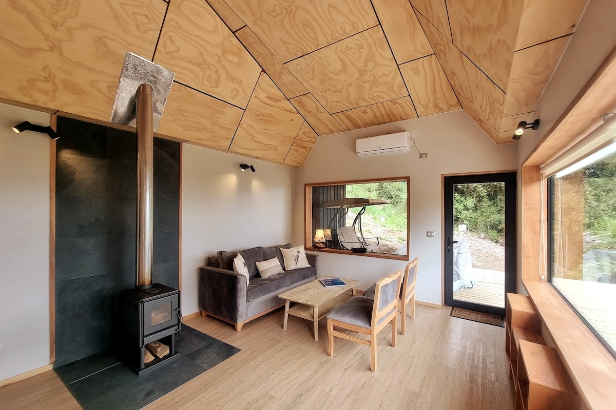 Cabaña de diseño en Futrono, puerta de entrada al Lago Ranco. Un refugio para quienes buscan descanso con estilo y comodidad. Capacidad 4 huéspedes: 2 dormitorios con closets (cama king y litera), baño moderno con secador, cocina equipada, calefacción y estacionamiento privado. Disfruta del deck exterior y los ventanales al paisaje. A 2 km de la playa y paseos por la cuenca del lago. 🐾 Pet friendly. Parrilla disponible bajo solicitud para una experiencia campestre única.