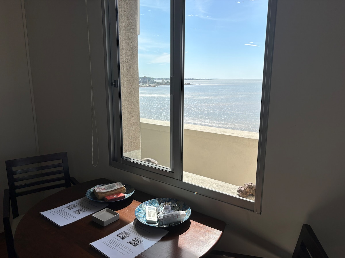 Monoambiente único en Montevideo! Reciclado estilo Industrial/contemporáneo con vista directa al mar y toda la bahía/playa de pocitos. Ubicado en el histórico edificio "Rambla" en el barrio Pocitos, una de las zonas mas exclusivas, comunicada y segura de la ciudad. Imagínate desayunar en la barra de la terraza con una impactante vista antes de un día de paseos, para luego volver a descansar en un colchón cómodo y un estudio acogedor y calefaccionado. Eso es lo que es nuestro apartamento.