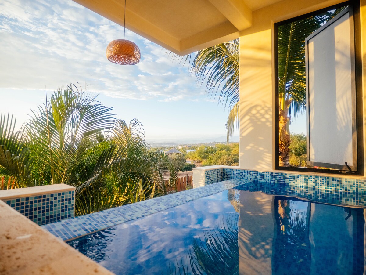 Acogedora suite con cama Queensize, Smart TV, Aire acondicionado, ventilador de techo, cocina, baño y jacuzzi privado. Disfrute de los atardeceres y relaje su mente mientras contempla la vista panorámica de la ciudad, el océano y las montañas desde su jacuzzi privado. Nos encontramos en Punta Zicatela, a 7 minutos caminando de la playa, principal punto de surf, restaurantes, bares y zona comercial. Cerca de todo, pero fuera del bullicio de la fiesta. Contamos con Internet Starlink.