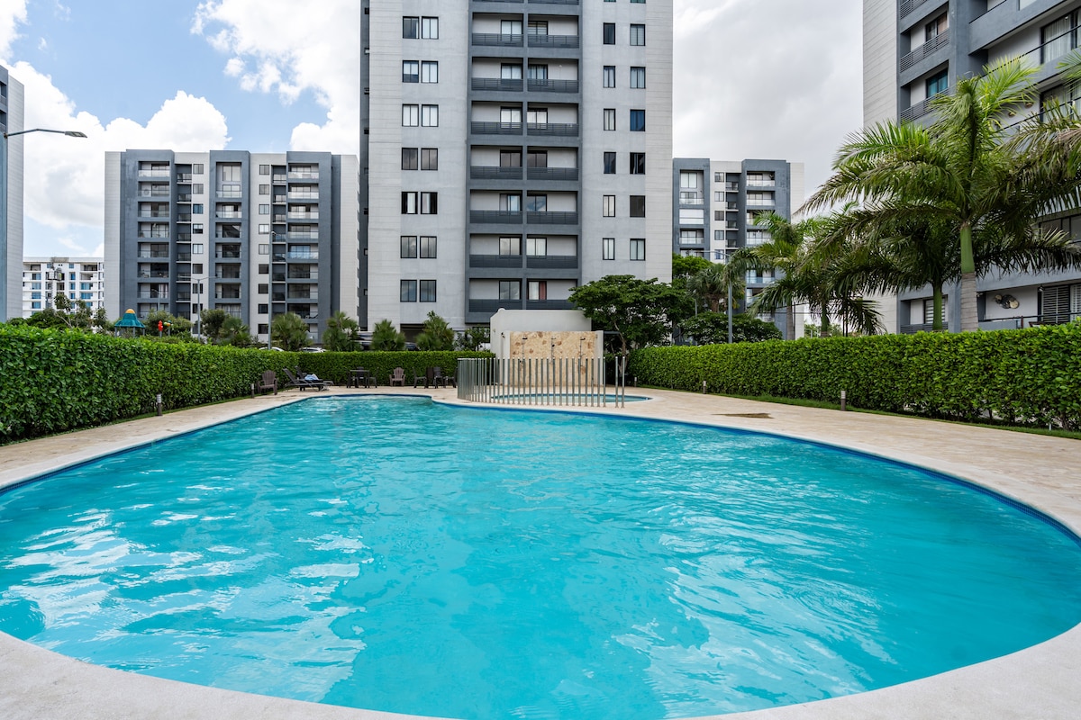 Nuevo y moderno apt, espacio cómodo y bien iluminado Cocina bien equipada y un baño limpio y espacioso, Parqueo privado y seguro con seguridad 24/7. , localizado a 10 min del Aeropuerto, centro de ciudad ect perfecto para disfrutar de un espacio comodo y tranquilo con toda su familia equipado con 3 dormitorios con tv wifi y aire acondicionado, Tenemos salon de eventos privados, piscina, villar, gimnasio, area de BBQ, area de juego para niños, cancha de basketball, wifi.