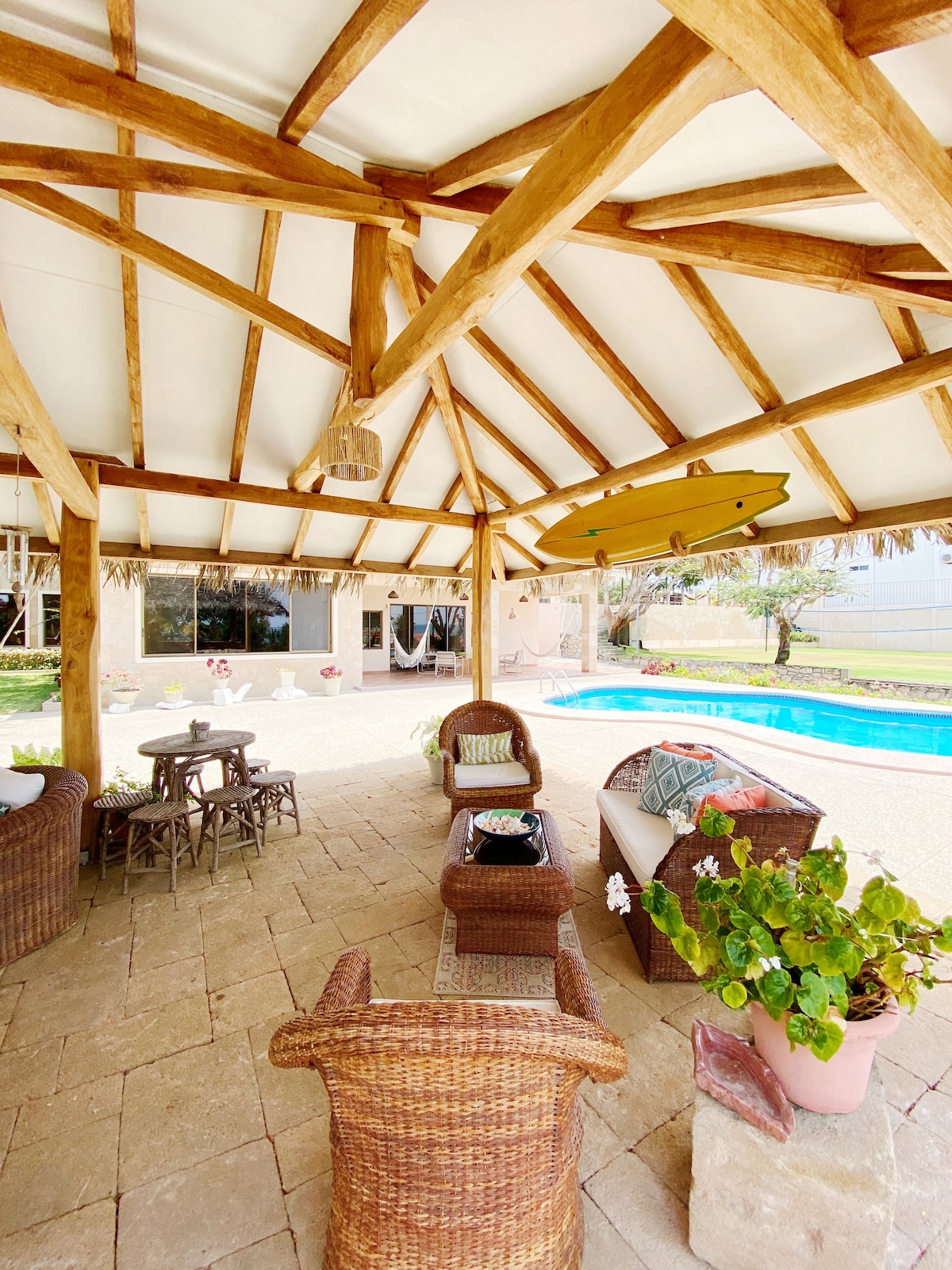 Playa privada y tranquilidad total ! Bella casa estilo industrial al pie del mar ,piscina, área de parrilla, WIFI, muy tranquilo y seguro para unas vacaciones de relax . 4 dormitorios con ventiladores ,3 baños completos , áreas al aire libre ,playa extensa para caminatas , garaje privado Guardia privado 24h .A 20 min de Montañita y de Salinas ,10 min.de Punta Blanca ,5 min. del pueblo de San Pablo. Supermercado a 20 min. Personal de cocina y compra de alimentos (costo extra) a disposición.