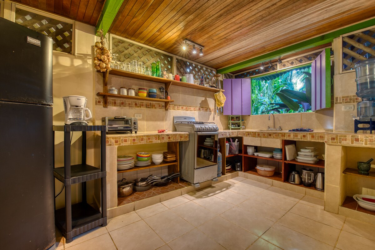 Escápate a Puerto Viejo en nuestra casa con aire acondicionado, cocina a gas y un armario espacioso. Relájate en tu patio privado cubierto. Nuestra casa se encuentra a solo 200 metros de la impresionante playa de Playa Chiquita, en uno de los vecindarios más seguros y tranquilos del Caribe. Explora atracciones cercanas como Puerto Viejo, Manzanillo, la playa de Punta Uva y Arrecife desde nuestra ubicación perfecta.