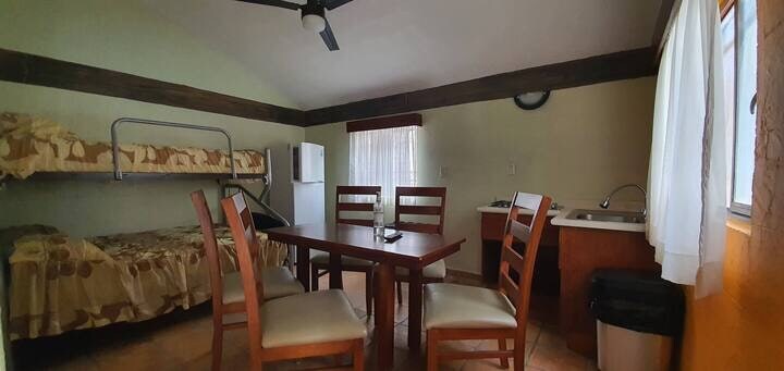 Cabaña ideal para disfrutar con tu familia. Siéntete de Vacaciones y pasa tiempo con tus niños y pareja. La cabaña cuenta con todas las comodidades para relajarte y descansar de la rutina. Los niños y tú estarán contentos de nadar en la alberca, así como de disfrutar de las áreas comunes del parque que se encuentren en servicio el día de tu visita: albercas, asadores, área de fogata, tobogán, senderos de caminata y muchas áreas verdes. Contamos con servicio de alimentos.