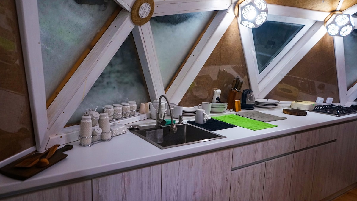 Alquilo un geo-domo en el pueblo de Snidovka, distrito de Kosiv, región de Ivano-Frankivsk. La casa está en el bosque, en las montañas, en un lugar tranquilo para relajarse. Construido en 2022, tiene una cocina estudio, dormitorio en el segundo nivel, ducha, agua caliente, lavadora, refrigerador. Adecuado para 2-3 personas. Hay áreas de meditación, baño en la fuente en la propiedad. Adicional: sauna, tina. En la casa: ropa de cama, toallas, utensilios de cocina, energía de respaldo, parrilla, mantas calefaccionadas. Las comidas no están incluidas.