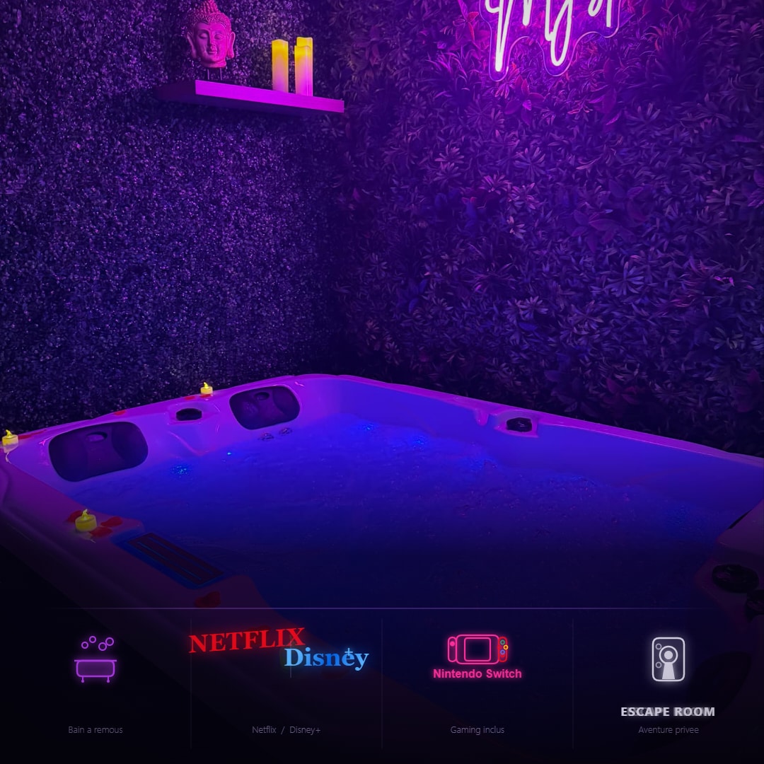 Alojamiento de alta gama con balneario, sauna, sofá tántrico, puerta secreta que revela un spa privado con sauna y mesa de masaje. Disfrute de un paréntesis de relajación en este magnífico alojamiento inspirado en Bali de 66 m² para dos personas. Todo confort: • Suite con cama King Size (180x200), ropa de cama de alta gama • Bañera doble con cielo estrellado • Habitación secreta con mesa de masaje y sauna • Sala de estar con chimenea de vapor y televisión conectada • Cuarto de baño con ducha doble • Sillón tantra