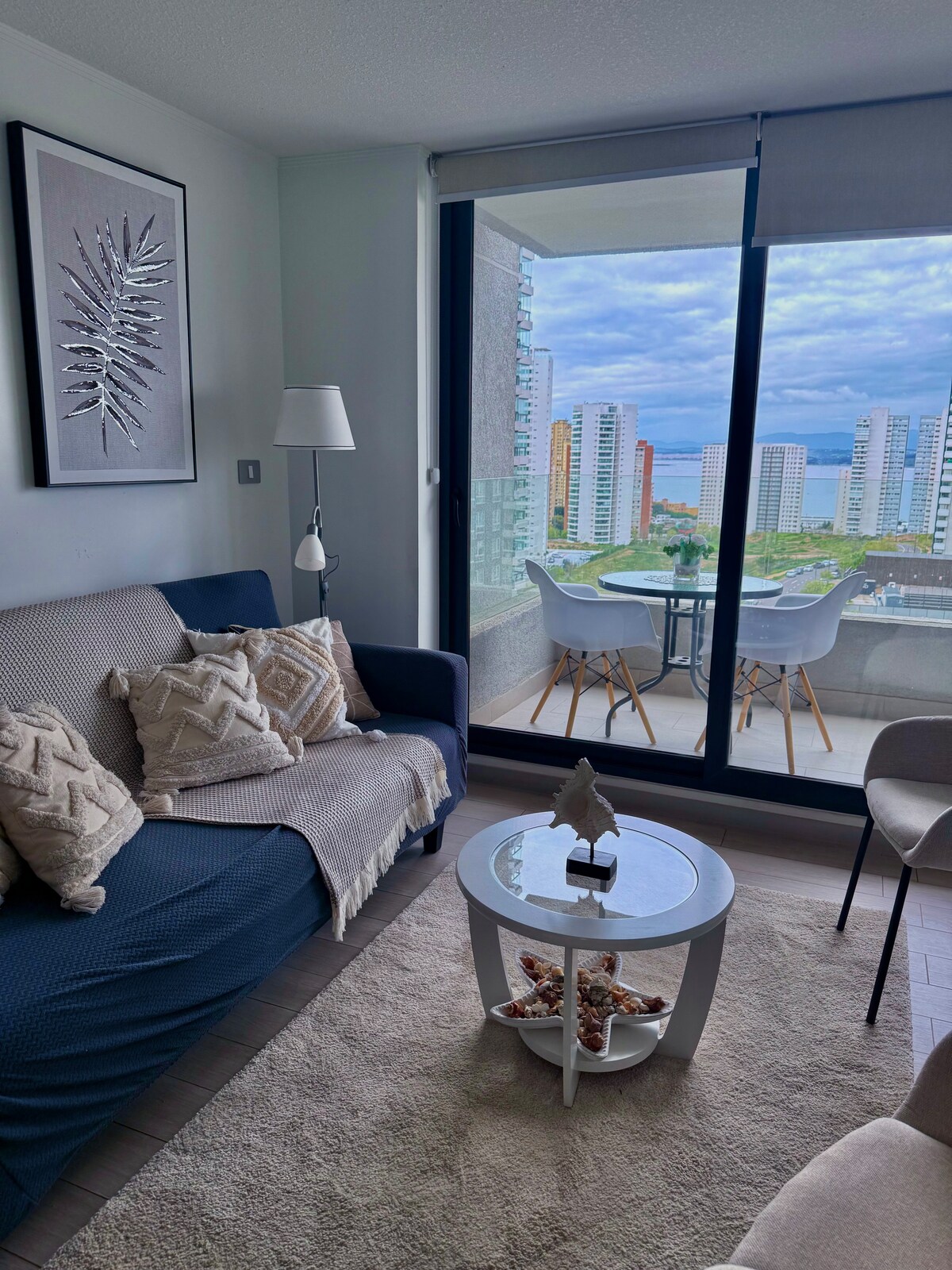 Increíble departamento para 4 personas con vista al mar. Cuenta con 2 piezas y 1 baño. Dormitorio matrimonial con cama de 2 plazas, otro pieza con camarote y futón cama. Cocina 100% equipada. Disponibles sábanas y lavandería en el piso 1 del edificio. Sin toallas, favor llevar propias. TV (Netflix) y escritorio ideales para descansar y teletrabajar con WiFi. Gran sector cercano al mall Marina Arauco, Homecenter y supermercado Líder a minutos de la playa Las Salinas. Incluye 1 estacionamiento.