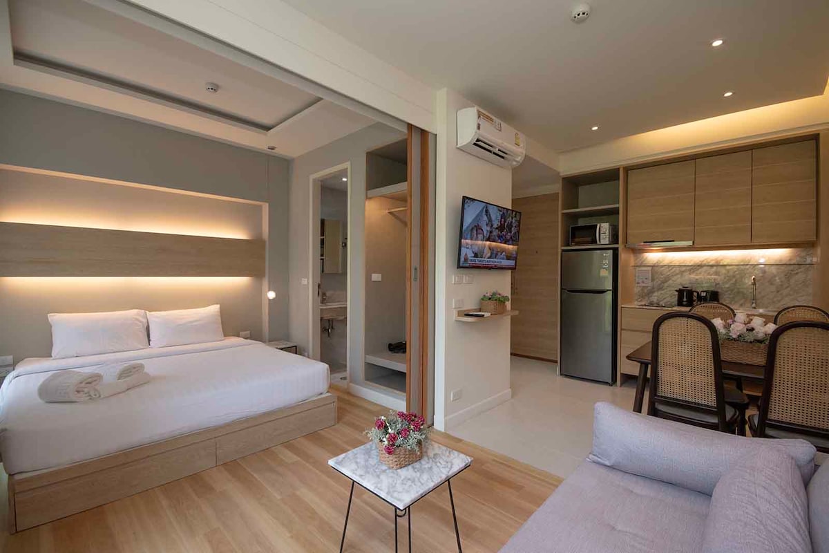 Un departamento elegante, céntrico, ubicado en el sexto piso del principal complejo de Ao Nang, Rocco Ao Nang. El apartamento de 35 metros cuadrados está lujosamente equipado con todo lo necesario para una estancia cómoda. Distancia a pie a pie de las playas (5 minutos), muelles de barcos y de todos los restaurantes y bares. Los huéspedes pueden usar el gimnasio, la piscina y la sauna del hotel. Estacionamiento en el lugar para bicicletas y autos. En este lugar tranquilo y céntrico.