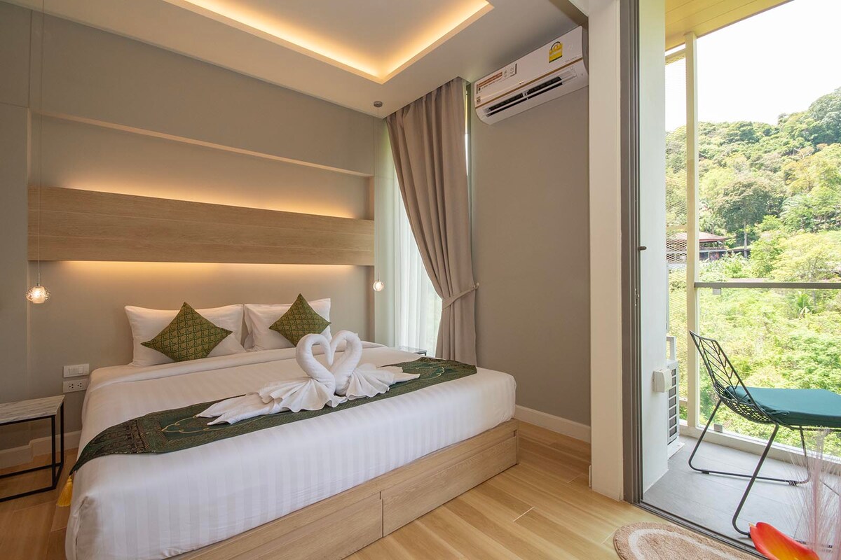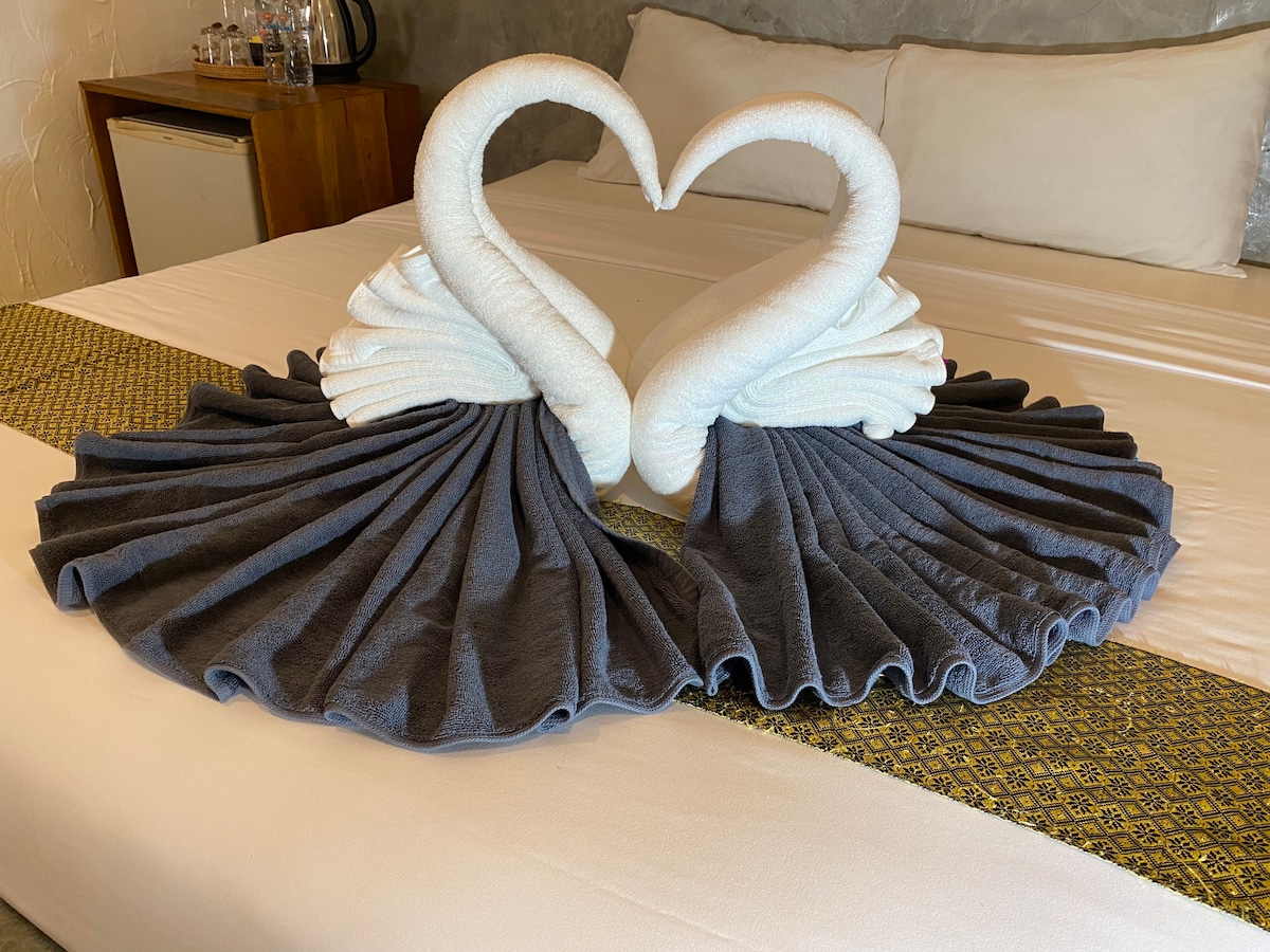Tipo de habitación: Habitación con aire acondicionado con una cama tamaño king, tamaño de habitación de 45 metros cuadrados. *No incluye desayuno para este anuncio. Ofrecemos alojamiento semanal diario. No se permite cocinar en la habitación. Nuestro centro vacacional también sirve como puerta de entrada a varios recorridos de aventura, escalada en roca de clase mundial, buceo de esnórquel, así como una puerta de entrada a la mundialmente famosa isla Phi Phi y más. Habitación con aire acondicionado Habitación privada Baño privado Estacionamiento gratuito Wi-Fi gratis