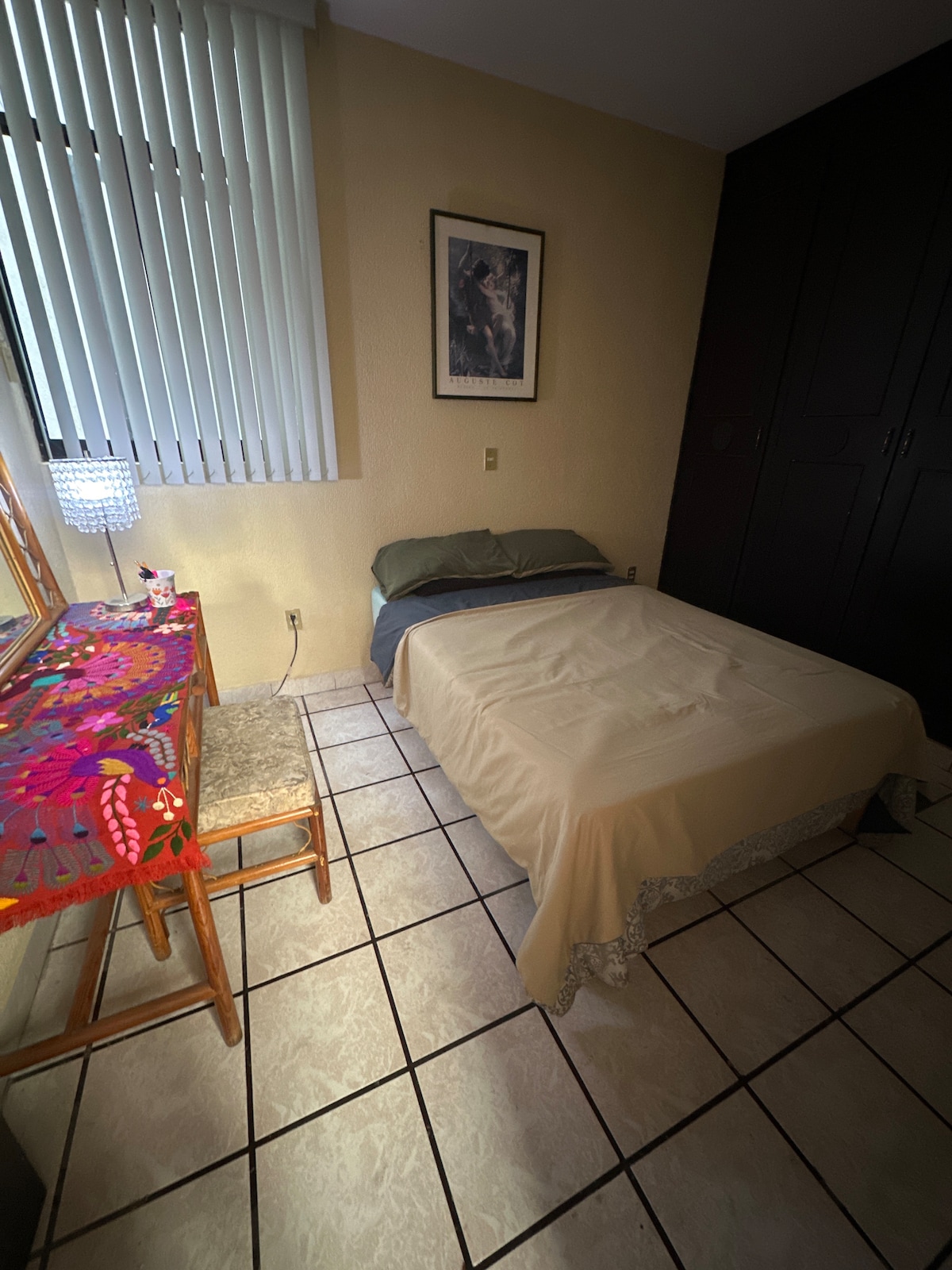 Alojamiento entero capacidad máxima cuatro personas. Tiene 3 habitaciones completamente privadas: una cuenta con cama matrimonial y las otras dos con camas individuales. El baño y la regadera están en áreas separadas para mayor comodidad. Está ubicado en un edificio muy céntrico: a espaldas se encuentra el Templo de La Purísima, dos cuadra de la Parroquia del Señor de la Piedad y una del Mercado Municipal.