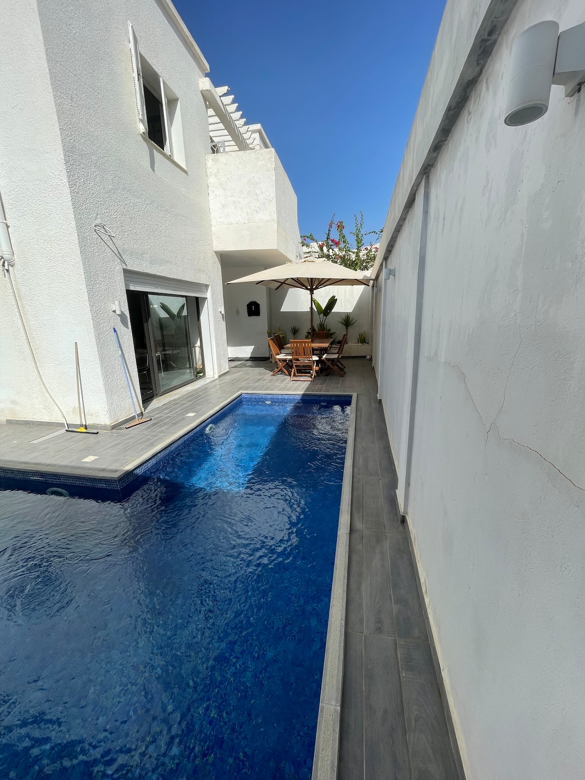 Planta baja independiente: 3 terrazas, amplio jardín, piscina privada, Hammam (de pago). Le encantará la decoración de madera de estilo balinés. Un 150 m² iluminado por grandes ventanales, amplio salón, 2 dormitorios cada uno con su propio baño, chimenea eléctrica, cocina equipada y espacio de oficina. Servicios incluidos: - Café, azúcar, agua a la llegada - Ropa de cama, sábanas, champú Servicios opcionales: - Servicio de transporte al aeropuerto - Desayuno, cocina TN - Hammam 30 euros