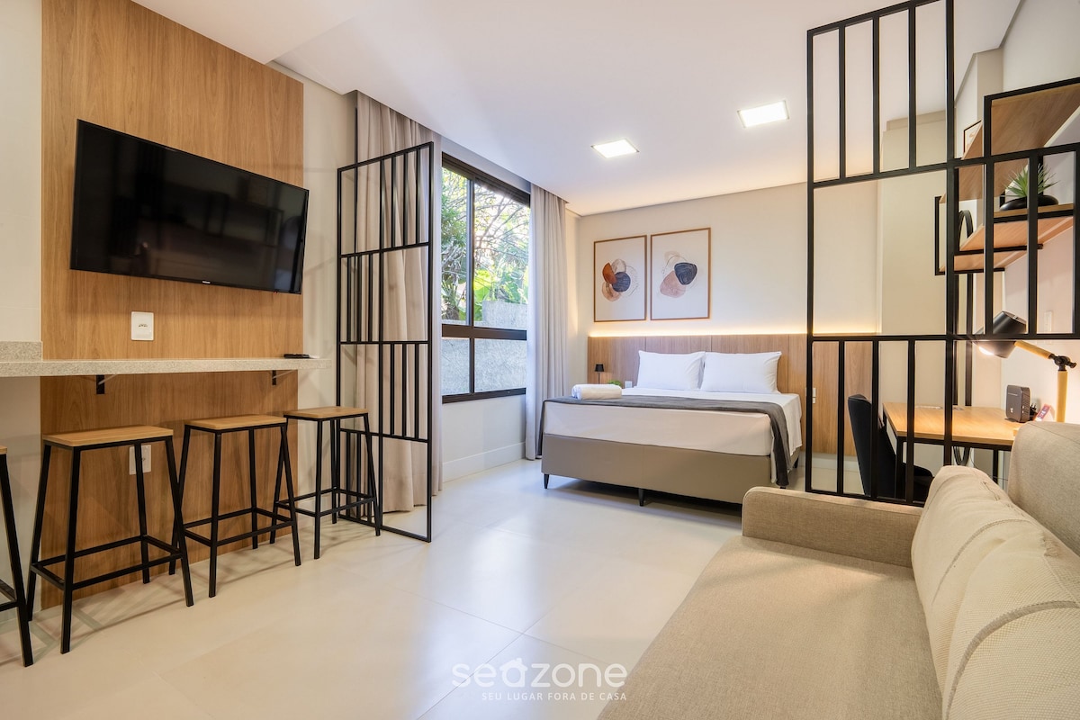 Estudio tranquilo, bien ventilado y cómodo, ideal para trabajar desde casa, aire acondicionado frío/calor, caminar y estar en la región central de Floripa, en el camino a las mejores playas. Escritorio y silla de oficina, cocina, baño. Hay otros espacios compartidos para prácticas de yoga (espacio Casa Aflorar), una vista privilegiada de Beiramar y la región, rodeada de vegetación nativa y jardines. Internet de fibra, freidora de aire, cortinas opacas. Gimnasios de culturismo cercanos, carriles para bicicletas.