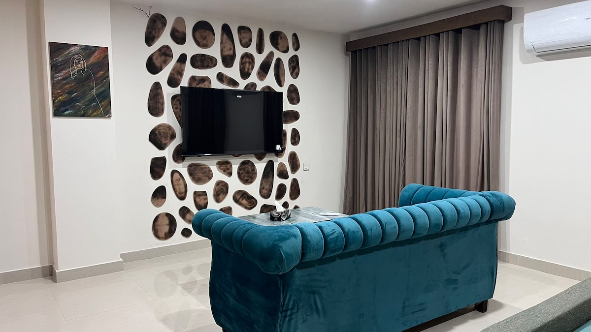 El Black Loft es un apartamento de diseño con un amplio salón y dormitorio, un televisor LED inteligente de 43 pulgadas, un sofá de 7 plazas, una cocina totalmente equipada y una pieza de decoración única, un cráneo de íbice de origen ético, que añade un encanto rústico al espacio. Ubicado en Bahria Heights 1, uno de los estándares de vida más premium mantenidos por Bahria Town. El apartamento está cerca de los principales restaurantes y cafeterías y cuenta con seguridad las 24 horas, los 7 días de la semana.