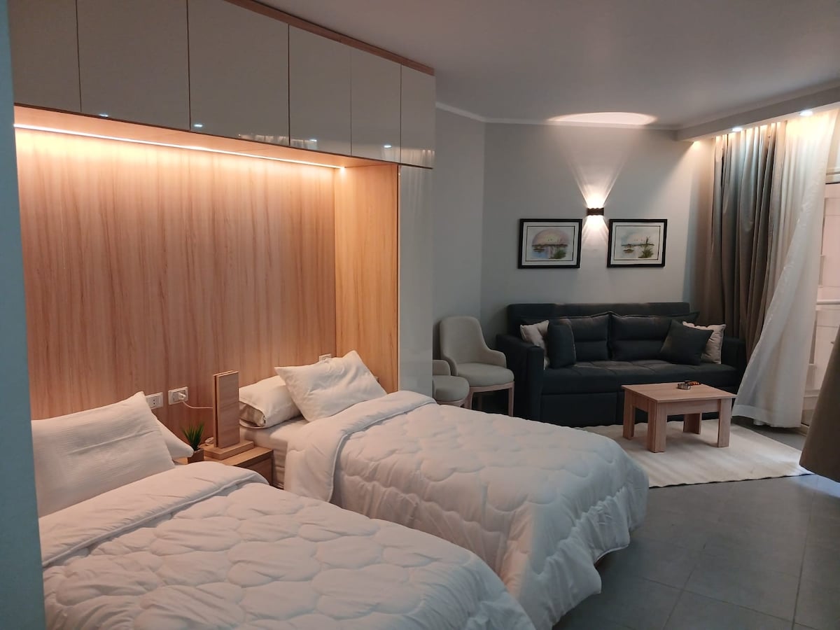 Un estudio de hotel ubicado en el centro del centro del centro del Haram, a unos 10 a 15 minutos en coche, centrado en la famosa calle Sultana de Madinah con restaurantes, cafeterías y servicios. Está a 3 minutos de la mezquita de Qiblatain y a 5 minutos de las universidades y con vistas a Wadi Al Aqeeq y cuenta con amplias y hermosas vistas. Te deseo una feliz estadía y que Dios te bendiga, querido huésped.