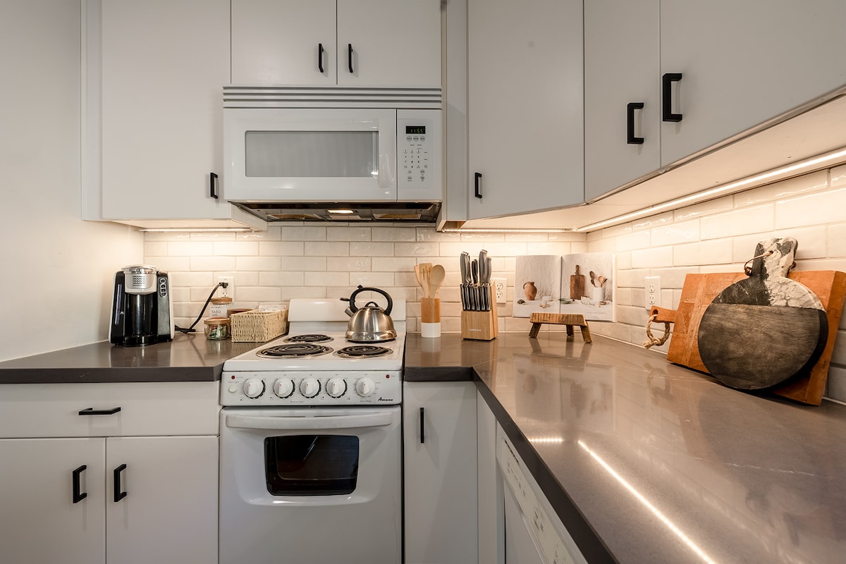 Apartamento ▸ remodelado de un dormitorio en el último piso en el vecindario de North End Televisión de▸ pantalla plana con acceso gratuito a Netflix, Disney+ y canales locales. Patio trasero▸ compartido con una zona de estar sombreada con sombrilla y un paisaje inmaculado. Ropa de cama de▸ lujo: cama tamaño queen con sábanas de 1000 hilos. Encanto ▸ histórico de 1938 con pisos de madera mezclados con comodidades modernas. La cocina▸ totalmente equipada incluye una estufa/horno, nevera/congelador de gran tamaño y comedor para cinco personas.