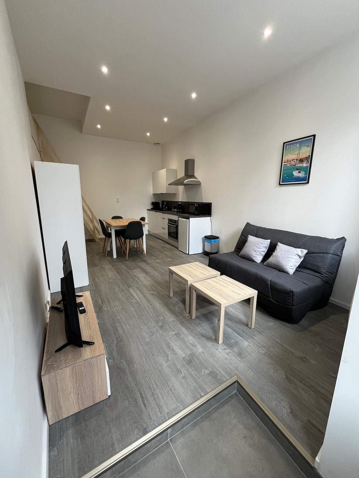 Estudio situado en el corazón de Redon Este alojamiento puede alojar hasta 4 personas gracias a: • una cama en el altillo (cama doble), • un sofá cama CÓMODO en la sala de estar. Allí encontrará una cocina totalmente equipada abierta con zona de comedor y sala de estar. Y un cuarto de baño (inodoro+ ducha) Todo está pensado para una estancia agradable, ya sea para una noche, un fin de semana o unas semanas. No hay TV y wifi Ropa de cama opcional 8€/persona (sábanas + toallas)