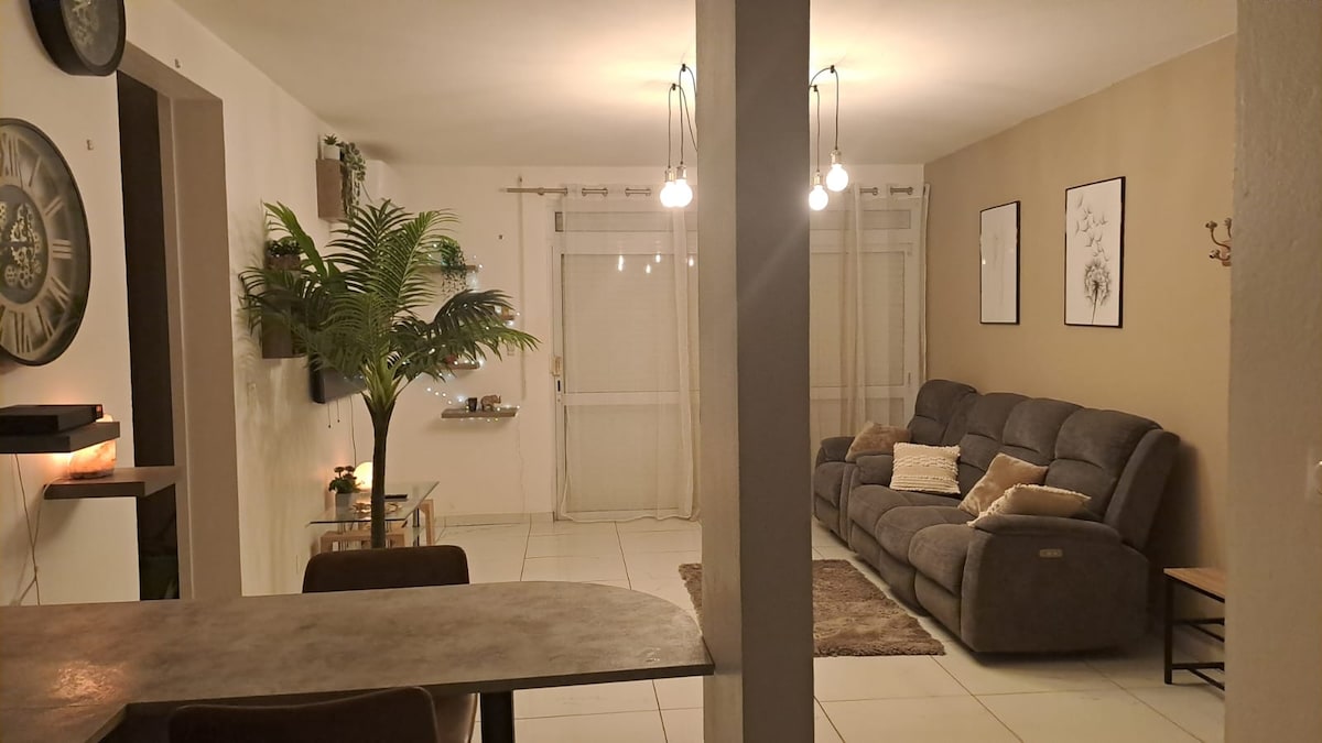 Apartamento coqueto, nuevo, con aire acondicionado y relájese en una cama king size con TV y un gran sofá cama con TV de 65". Cerca del pueblo, el aeropuerto, un gran centro comercial a 20 minutos. La terraza de 15 m2 para fumadores con un jacuzzi de 2-4 personas y 2 aparcamientos . La noche para 4 personas/mín. 1 noche. Por semana o mes, precio decreciente . Llegada entre las 13:00 y las 21:00/ salida entre las 6:00 y las 11:00. La entrada y la salida son autónomas con caja de llaves. Estamos clasificados con 3 estrellas.