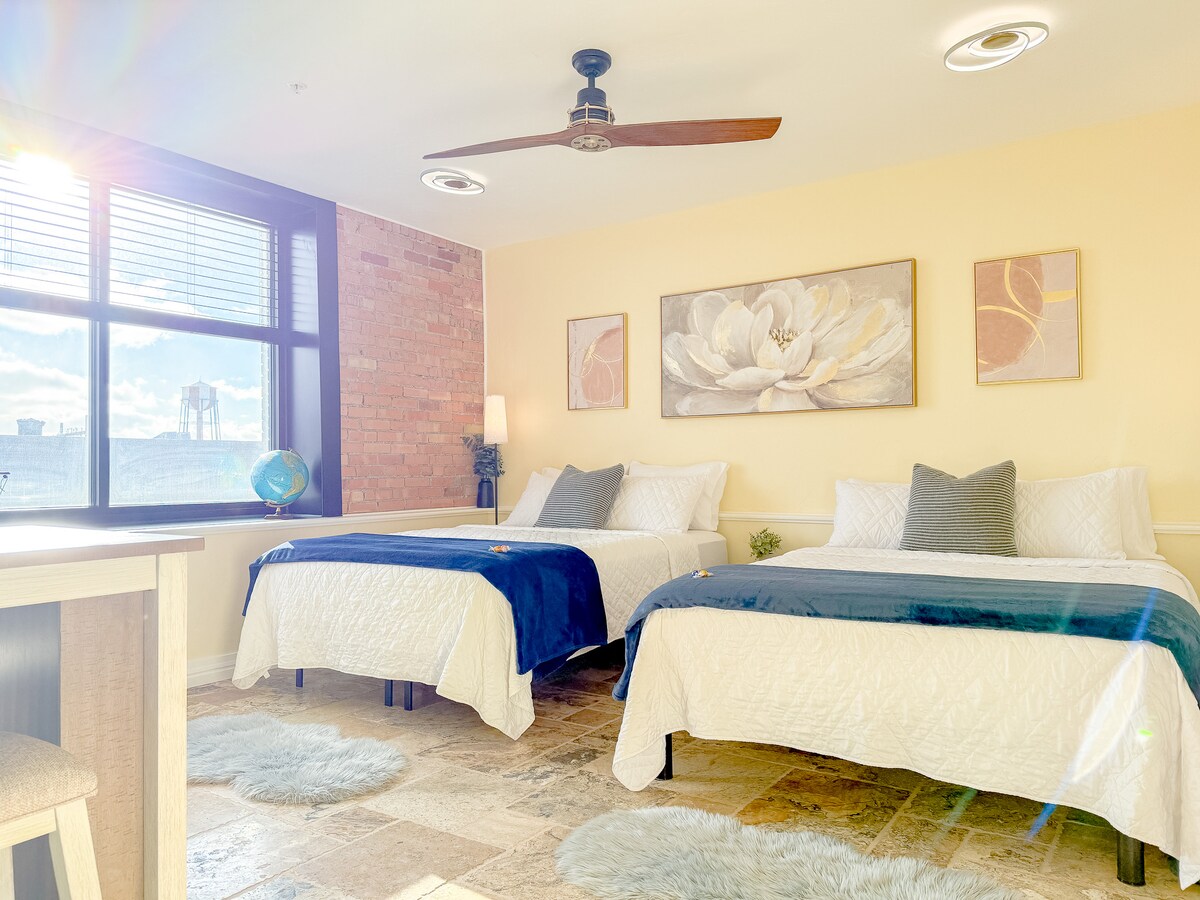 ¡Increíbles servicios en el corazón del centro de la ciudad! Cerca de los mejores restaurantes, tiendas locales y el río. Hay fácil acceso a la autopista y aparcamiento gratuito. La suite cuenta con una cocina totalmente equipada con electrodomésticos nuevos. Una lujosa ducha a ras de suelo y un lavabo de principios de siglo adornan el baño de baldosas de travertino. Disfruta de internet de fibra rápido para trabajar desde casa o ver películas desde una cómoda cama en el televisor de 65 pulgadas con todas las aplicaciones preinstaladas. Café y máquina de discos gratis en el vestíbulo y pinball en la lavandería.